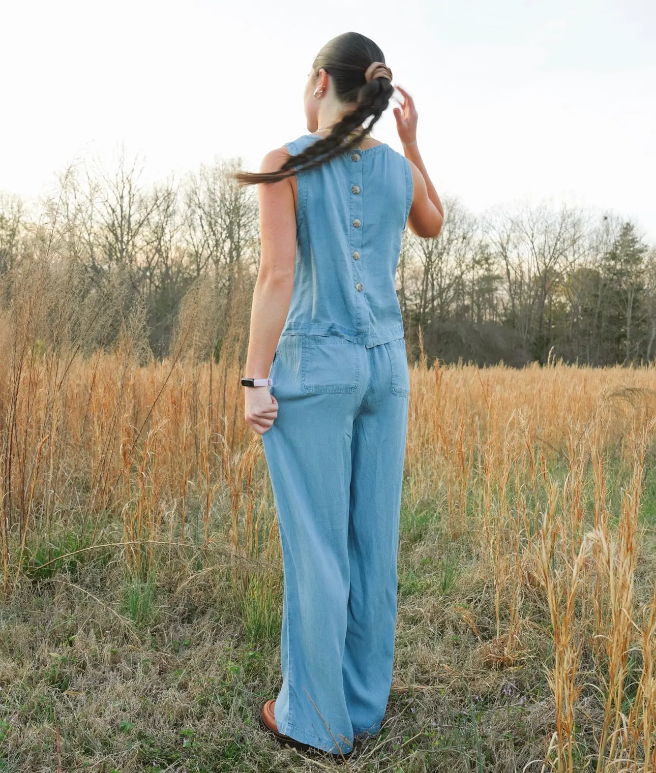 Meet your new go-to spring staple! This chambray sleeveless top is the definition of effortless style. Designed with a classic round neckline and back button details, it's the top that your spring wardrobe has been waiting for!