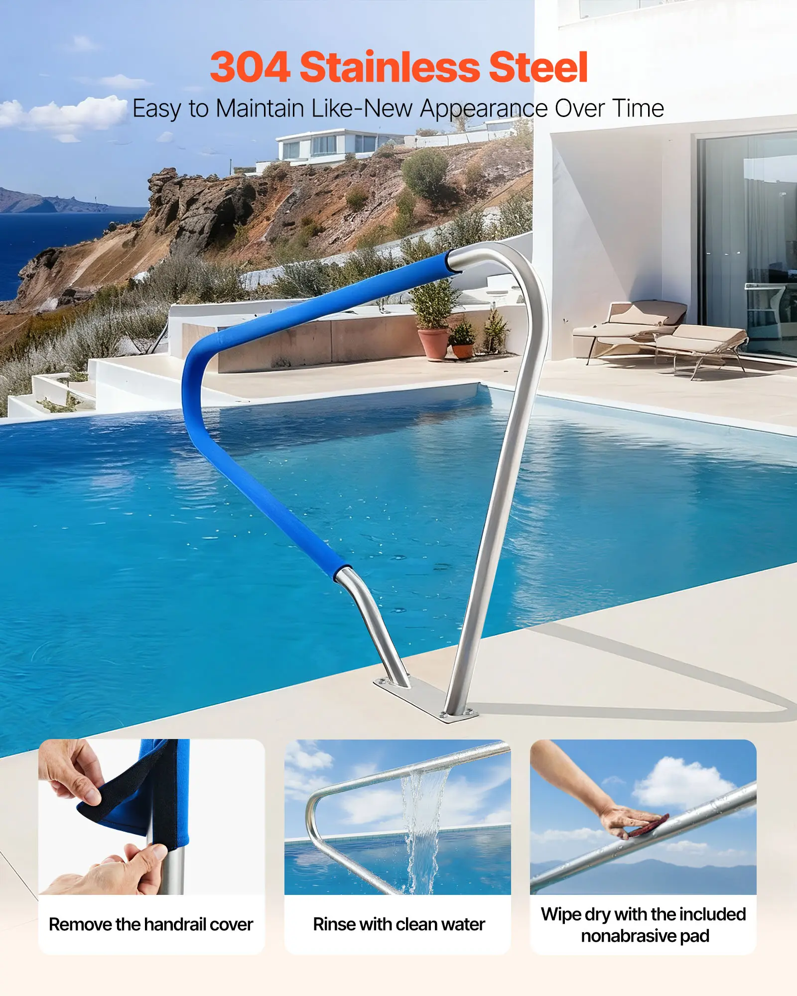 304 Stainless Steel Construction: Made from high-quality stainless steel pool rail, this adjustable pool handrail resists rust and corrosion. Includes cleaning cloth; avoid salt/chlorine pools, rinse with fresh water, and wipe clean to extend lifespan