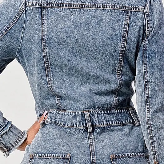 This sleek long sleeve denim romper is the perfect blend of casual chic and comfort. Crafted from a soft and durable denim fabric, it features a classic blue wash with a subtle fade for a gently worn-in look. The romper is designed with a figure-flattering silhouette, accentuated by a cinched waistline with a matching denim belt that ties the piece together. Button-down closures line the front, making it easy to wear, while the two chest pockets with flap closures add a functional touch to its stylish design.
