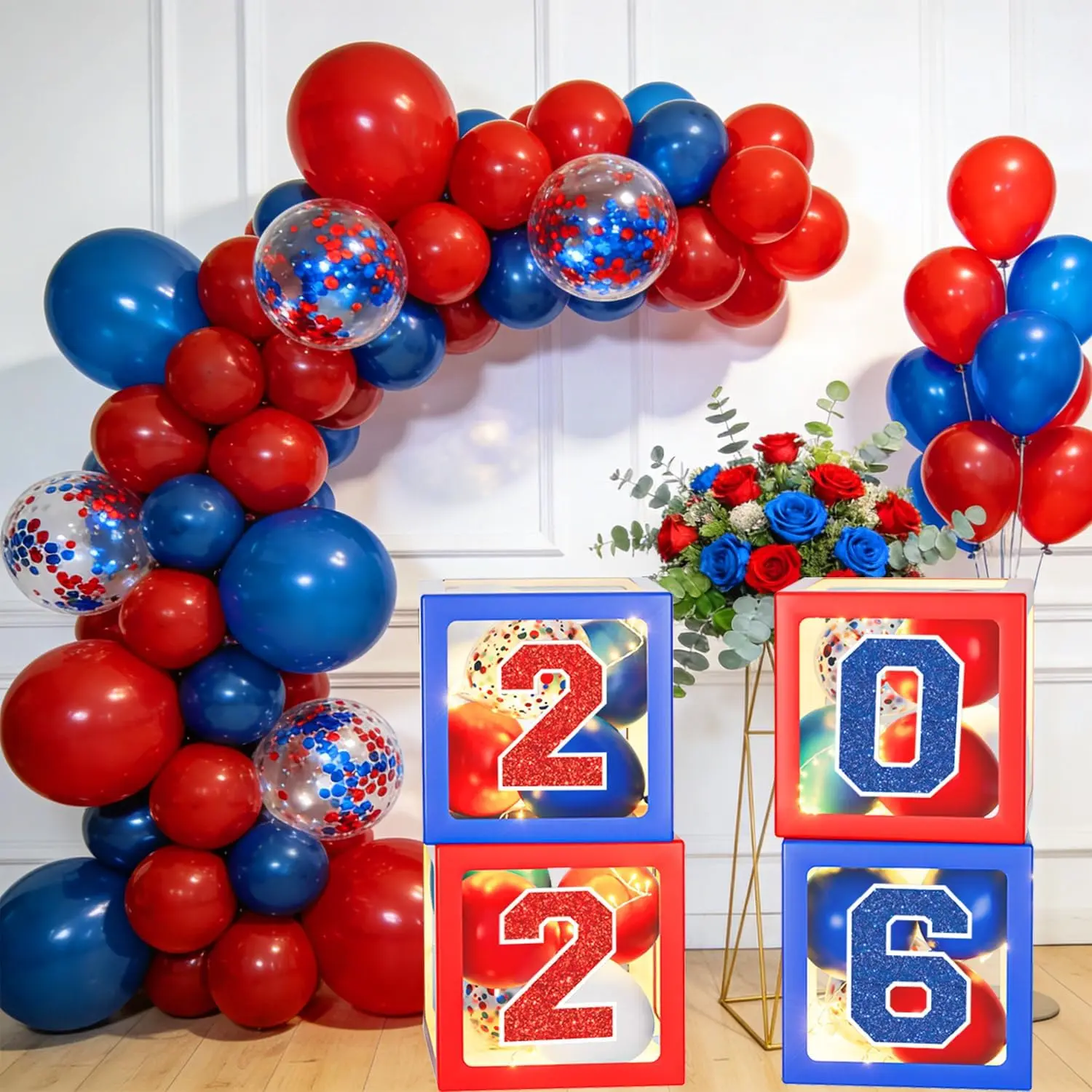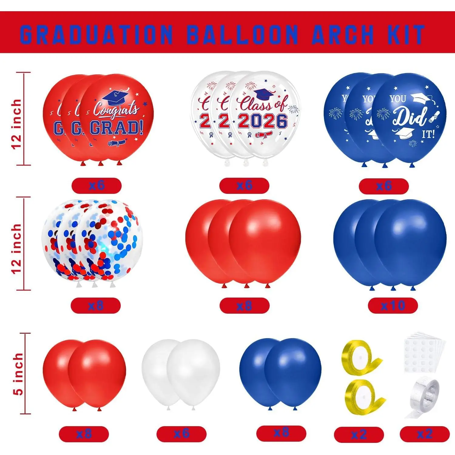 Graduation Decorations Class of 2026: This set includes 4 red and blue graduation boxes, 66 graduation balloons, "2026" numbers, "GRAD" letters, "So Proud of You" words, graduation hats, 1 sheet of glue dots, and 2 ribbons.Adorned with elegant graduation designs, these decorations not only elevate the look of your celebration but also set the perfect atmosphere to honor the significance of the occasion and create unforgettable memories for the Class of 2026Perfect for Any Graduation Celebration: Our 2026 graduation decorations set the stage for a celebration to remember.Whether you're celebrating a class event or an individual milestone, these decorative boxes paired with graduation-themed balloons add vibrant color and energy to your party.Designed to capture the spirit of graduation, they are the perfect finishing touch for any graduation event, ensuring your space looks festive and memorableRed & Blue Graduation Theme Design: These essential 2026 graduation party decorations add a touch of pomp and pageantry to any celebration.Featuring graduation caps, "So Proud of You," "You Did It" headlines, and other celebratory elements, this kit is versatile enough to match school colors or cater to personal preferences.This stylish design instantly elevates your graduation party décor and creates a photo-ready celebration spaceEasy Assembly & Durable Materials: The graduation boxes are made of high-quality paper, offering durability and being easy to clean.Designed for convenient assembly, these graduation party supplies can be reused or stored for future celebrations, saving time and effort while delivering a polished party setup.Graduation balloons are crafted from natural latex, can be filled with air or helium, are not easy to burst, and are safe to usePerfect for All Graduation Levels: These graduation decorations are versatile and suitable for high school, college, and doctoral graduation celebrations, allowing you to celebrate in style at any stage. Use them indoors or outdoors, or create a memorable graduation photo backdrop. Designed to enhance any party space, these decorations complement other party essentials and help create an impressive, photo-ready celebration