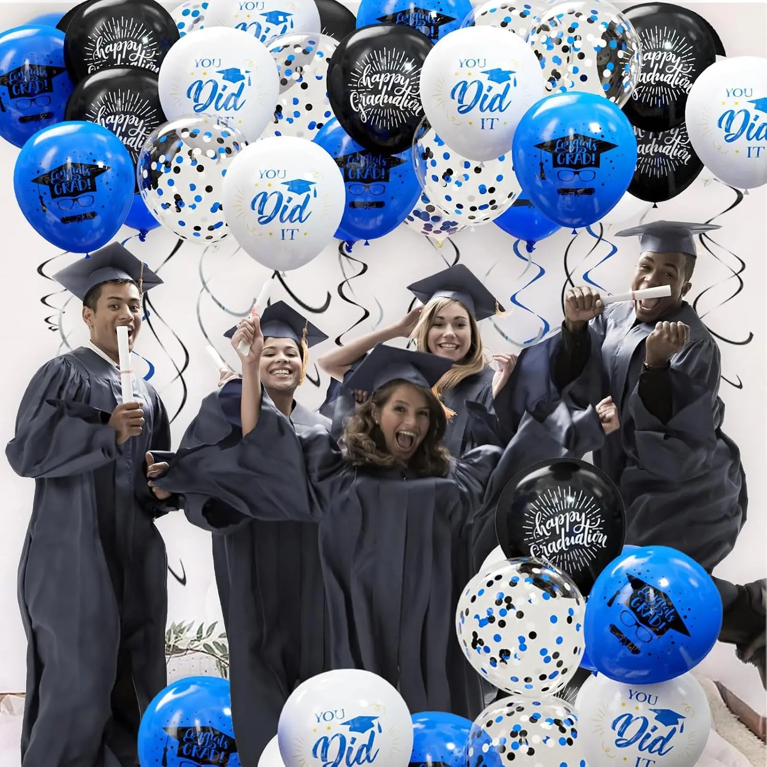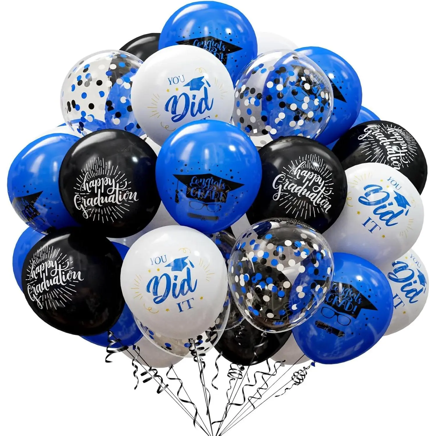 Graduation Balloons:Our 12 inches Graduation party balloon kit including black, blue, white and blue black confetti balloons, and balloon ribbons, featuring with the words of "Happy Graduation", "You Did IT", and " Congrats GRAD".Premium Material:Blue black graduation balloons were made by natural latex, helium supported.Each balloon has been rigorously tested and selected manually, ensuring safety for.Graduation Decorations:Printed grad balloons are perfect for 2026 graduation party, class of 2026 party, college, high school, nursing, doctorate graduation parties or celebrations.Congrats Grad Party Decor:Graduation decoration balloons are created to leave everyone with beautiful memories! Make the confetti stick to the side of the balloon by shaking it and gently rubbing it on your hair, silk, or wool. Alternatively, pop the balloons to let the confetti fall, adding a lot of fun to light up the beautiful night and make this an unforgettable moment for your kids, yourself, your family, and your friends.Shop with Confidence: We strive to offer top-notch products and unparalleled service.Should you have any issues or questions, please reach out to us