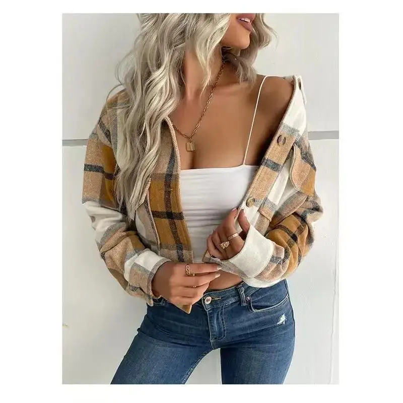 Long Sleeve Flannel Cropped Shacket Plaid Button Down Shirt Jackets For Women With Lapel Pockets