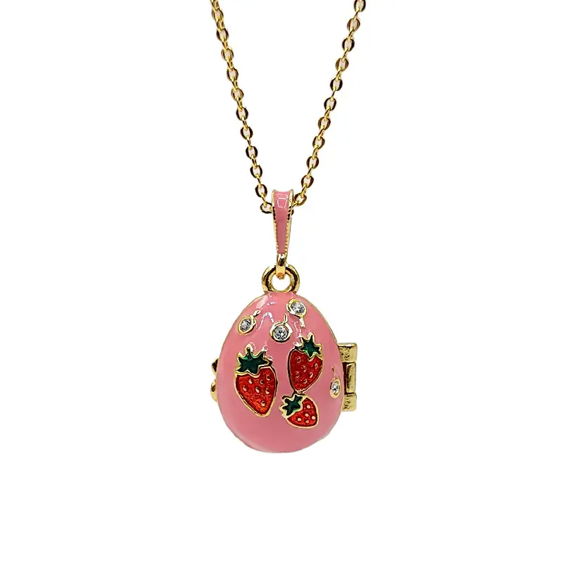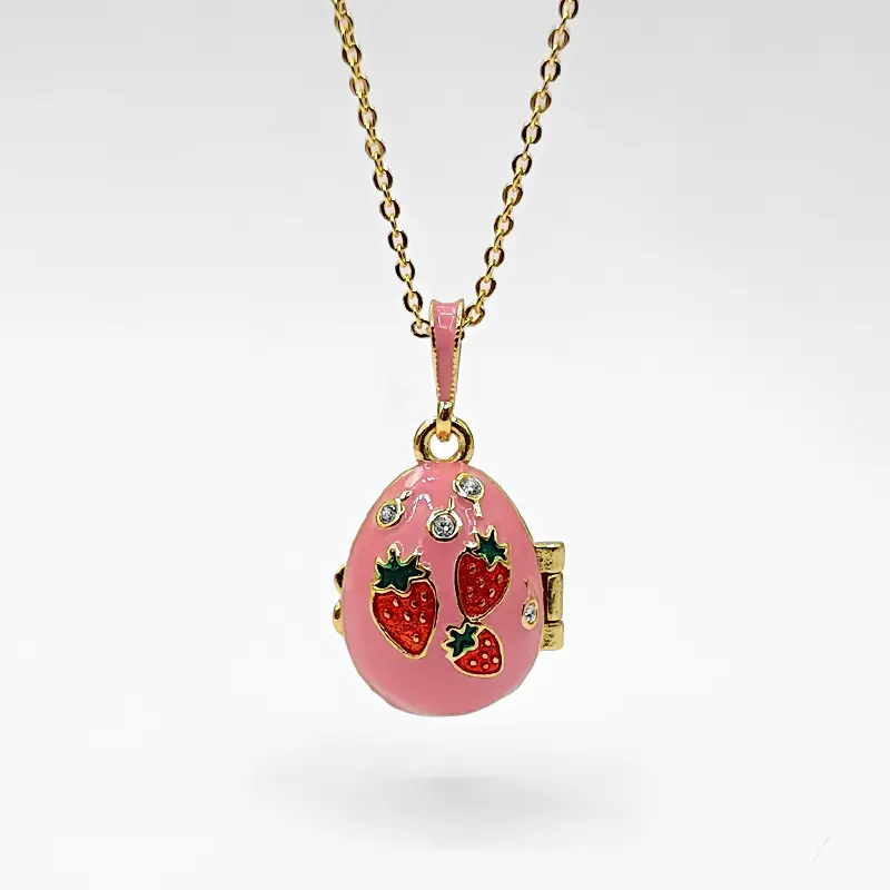 Surprise Butterfly Locket Necklace, Pink Enamel Cherry Egg Pendant, Openable Jewelry with Secret Charm, Gold Tone Cottagecore Aesthetic, Unique Gift for Her