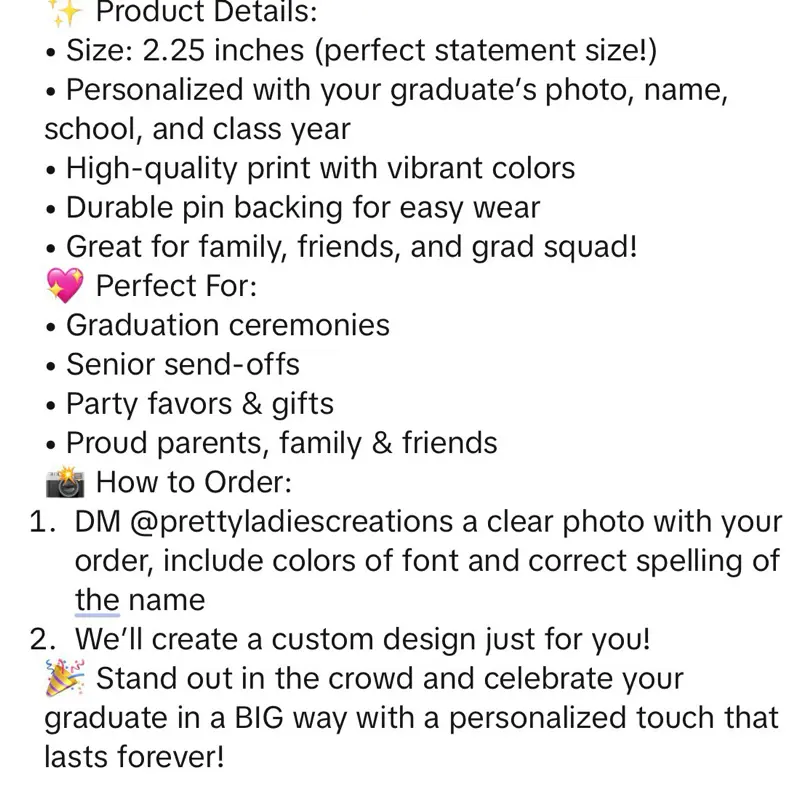 Make graduation extra special with our custom 2.25-inch photo pins the perfect way to show off your graduate with pride! Whether it’s for senior night, graduation day, or a celebration party, these pins are a must-have keepsake 💕