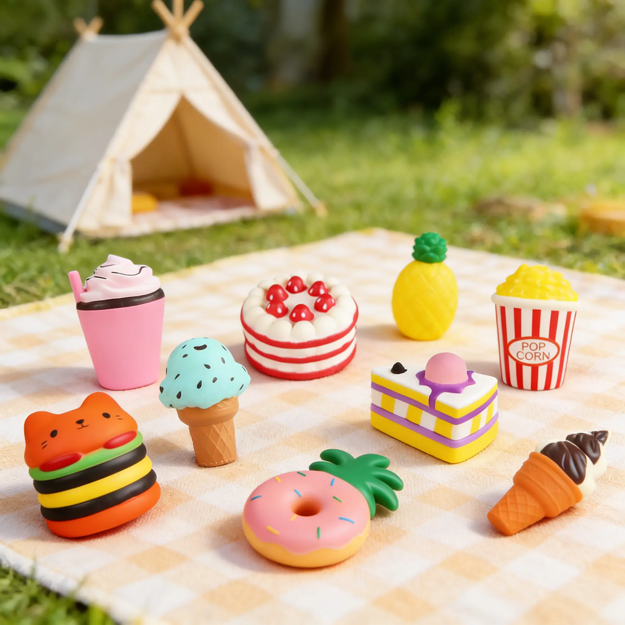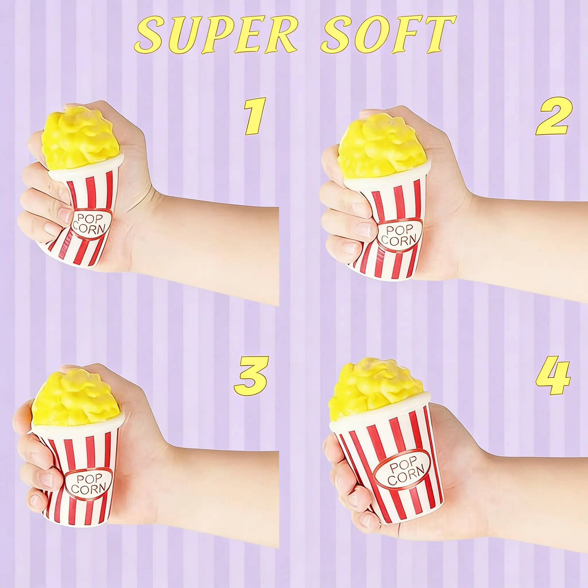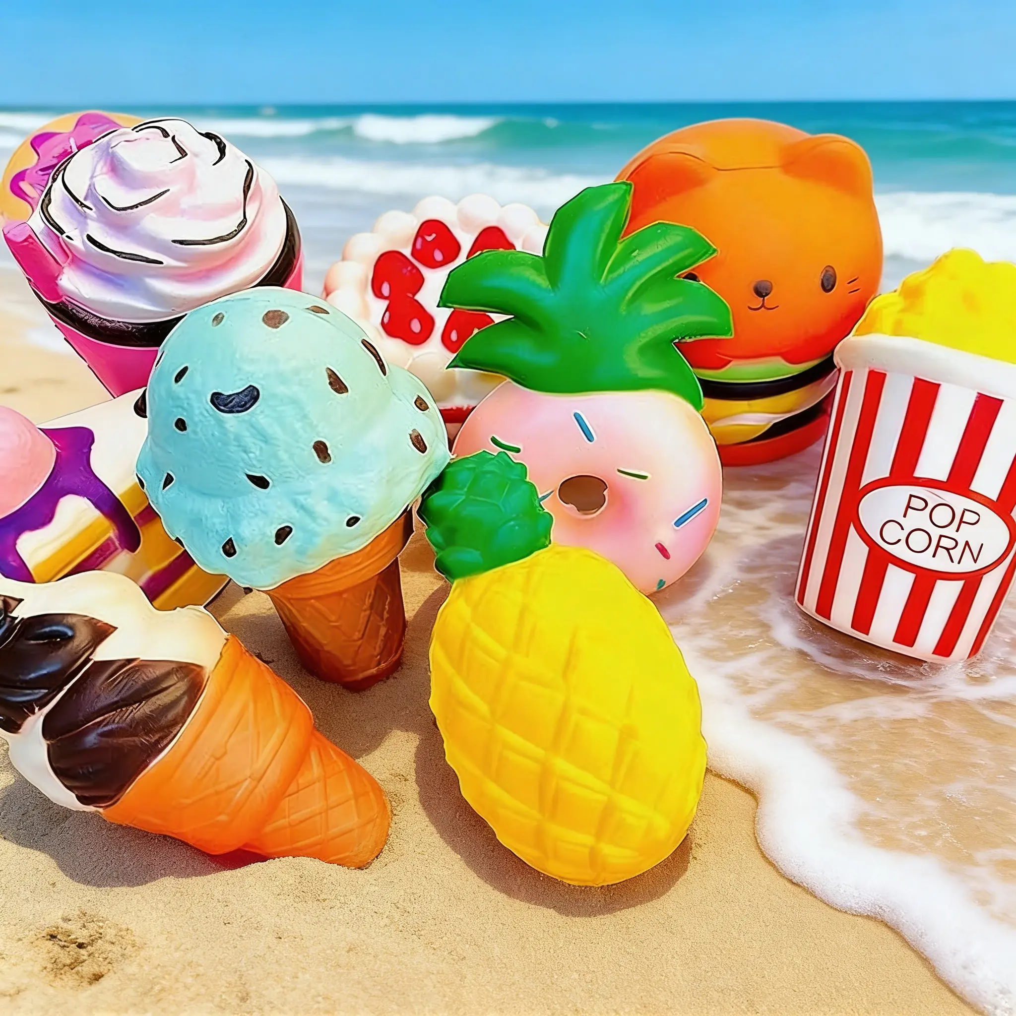 For Kids – This set includes 9 soft squishy toys in food shapes. Each piece measures 3 to 4 inches. The pack contains a hamburger, popcorn, cake, donut, pineapple, and ice cream in various colors and designs.