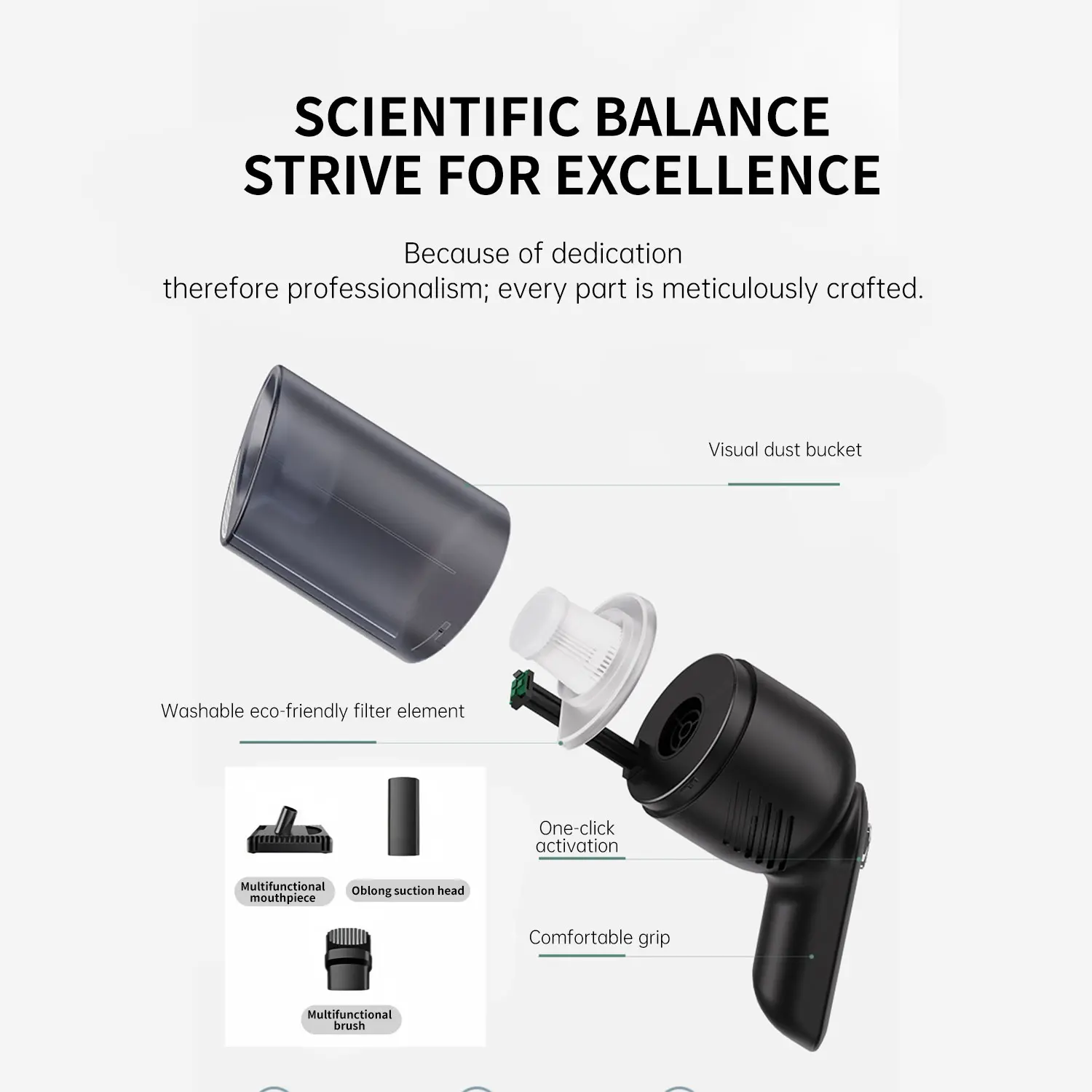 ·【Effortless Maintenance】With just one-click disassembly, you can easily empty the dust cup and clean the vacuum. The HEPA filter is washable and reusable, ensuring efficient suction while trapping dust and debris to prevent blockage. To maintain optimal performance, please clean the filter regularly after use, and ensure it is completely air-dried before reinserting