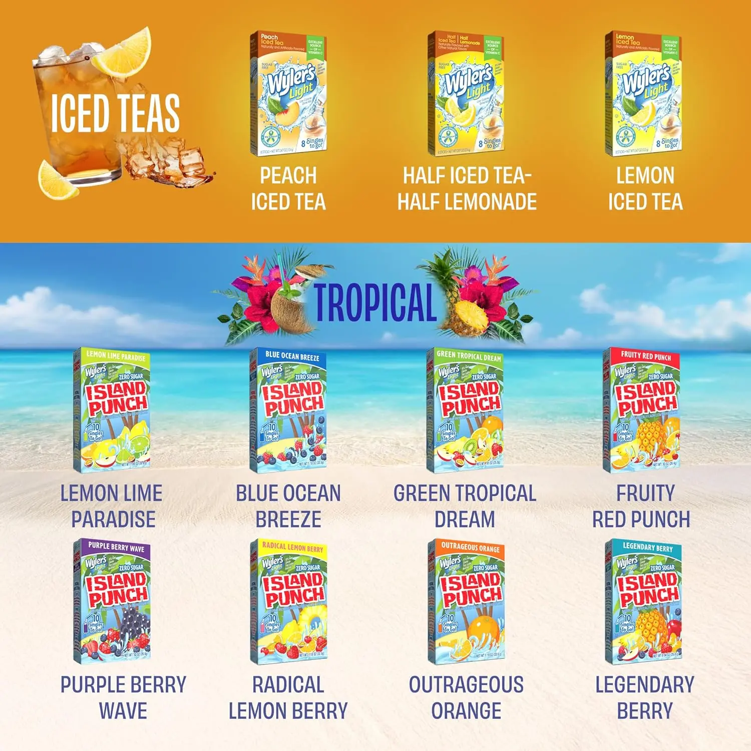 ·Flavor Variety: 20 different flavors including lemonade, iced tea, fruit punch, and tropical blends