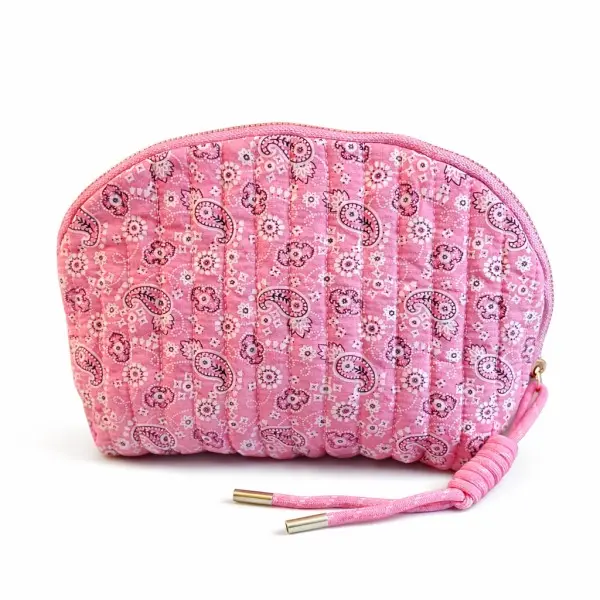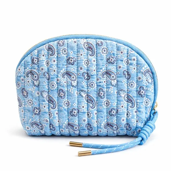 Add a playful pop of color to your routine with this quilted paisley cosmetic case. Designed with a curved silhouette and soft padded structure, it features a bold bandana-inspired print and a knotted cord zipper pull. Available in pink, blue, or green—perfect for makeup, skincare, or travel essentials.