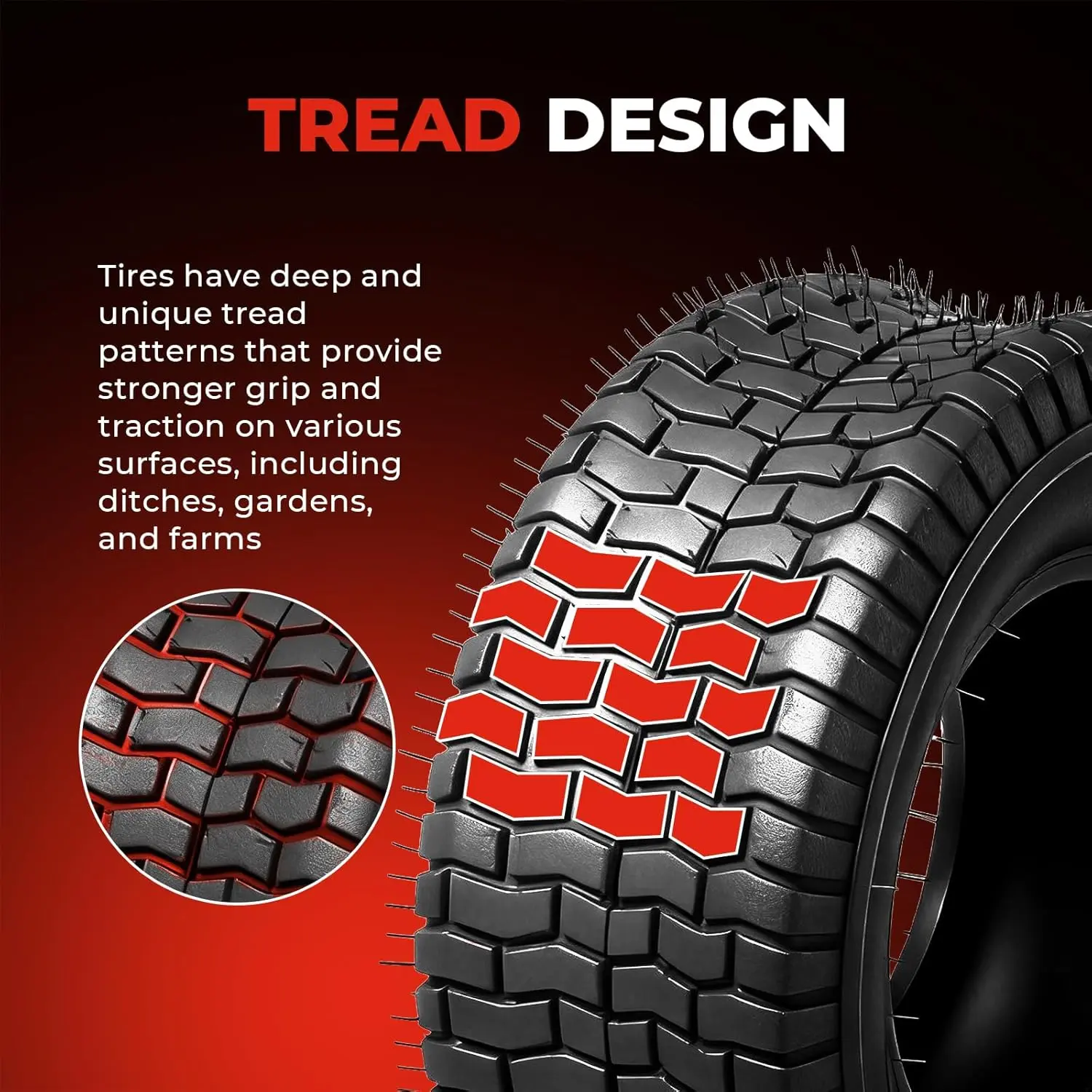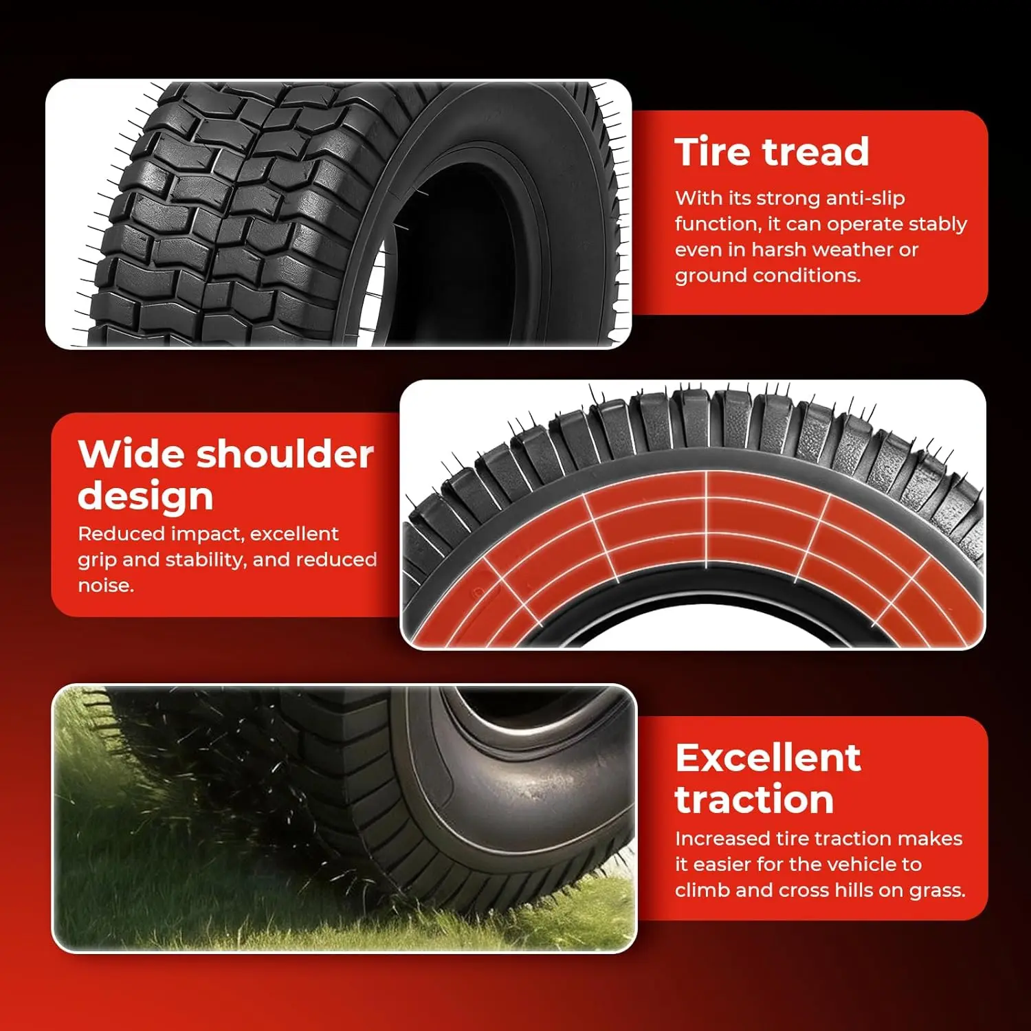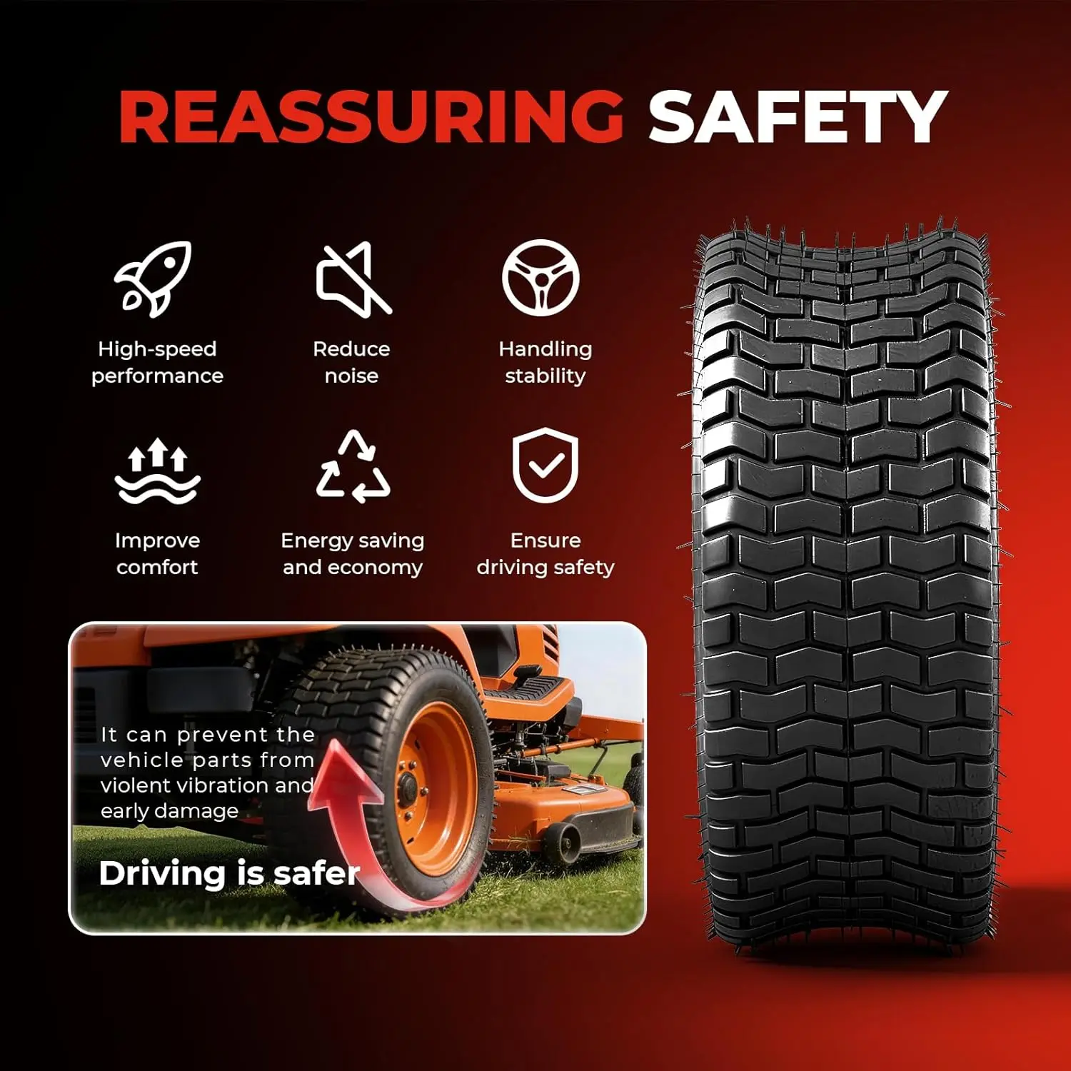 Features:13-5.00-6,13x5.00x6, 13x5.00-6, 13x5.0x6 tires the unique patterned tread design provides better grip on grass, maximum grip and weight distribution,especially on slopes with slip risks. This design will greatly reduce damage to the lawn and be lawn friendly. lawn mower tire combine superior structural integrity with long-lasting wear resistance,they provide a safer and more reliable user experience