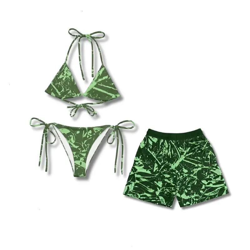 This two-piece bikini set is perfect for gym, running, training, basketball, and everyday casual wear. The set includes women's two-piece bikini and men's athletic camo mesh shorts.