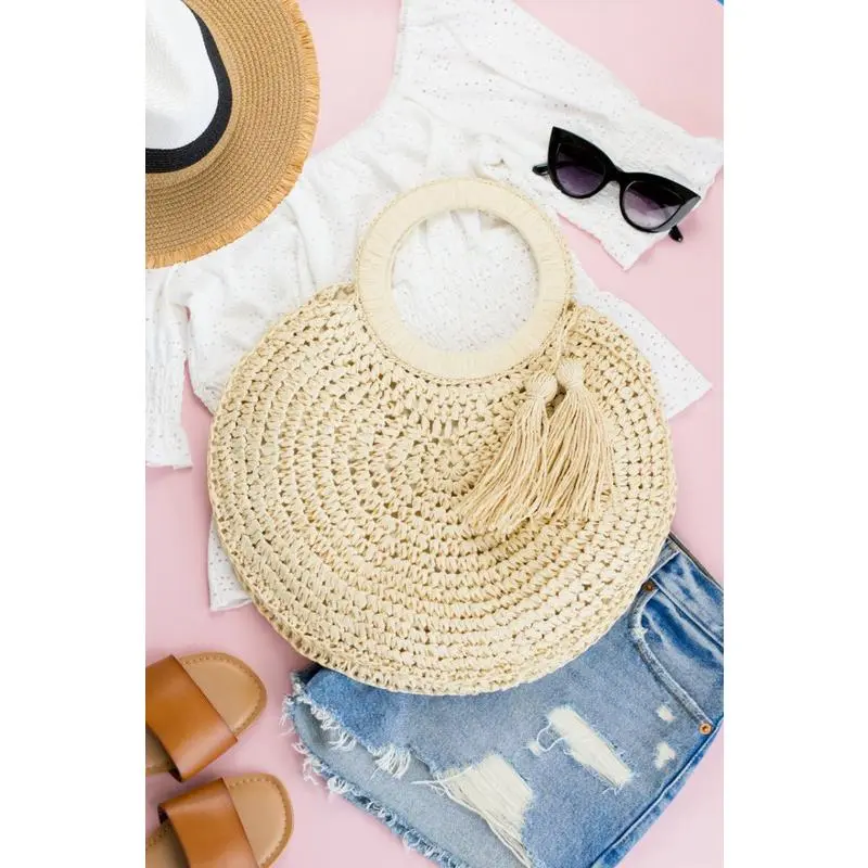Straw Tassel O-Ring Tote DETAILS Woven design Exterior- 100% Straw Lining- 30% cotton/ 70% polyester Measurements: 12" x 16" x 5" Handle Drop: 7.25" Straw tassel accent Zipper Closure Inside small open sidewall pocket