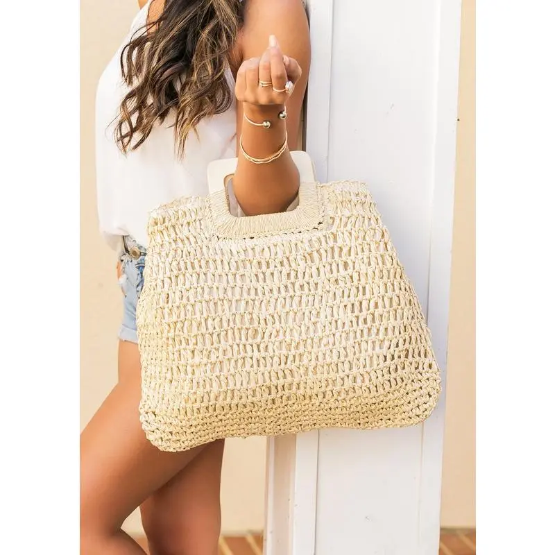 Oversized Straw Tote DETAILS Woven Detail Measures: 17.5" x 15" Exterior- 100% Straw Interior Lining- 30% Cotton/ 70% Polyester Natural Wood Handles Top Zipper Closure Exterior Side Snaps Inside Small Open Sidewall Pocket