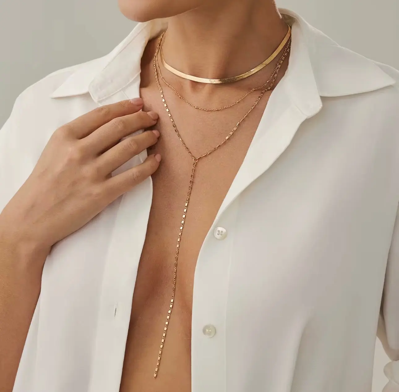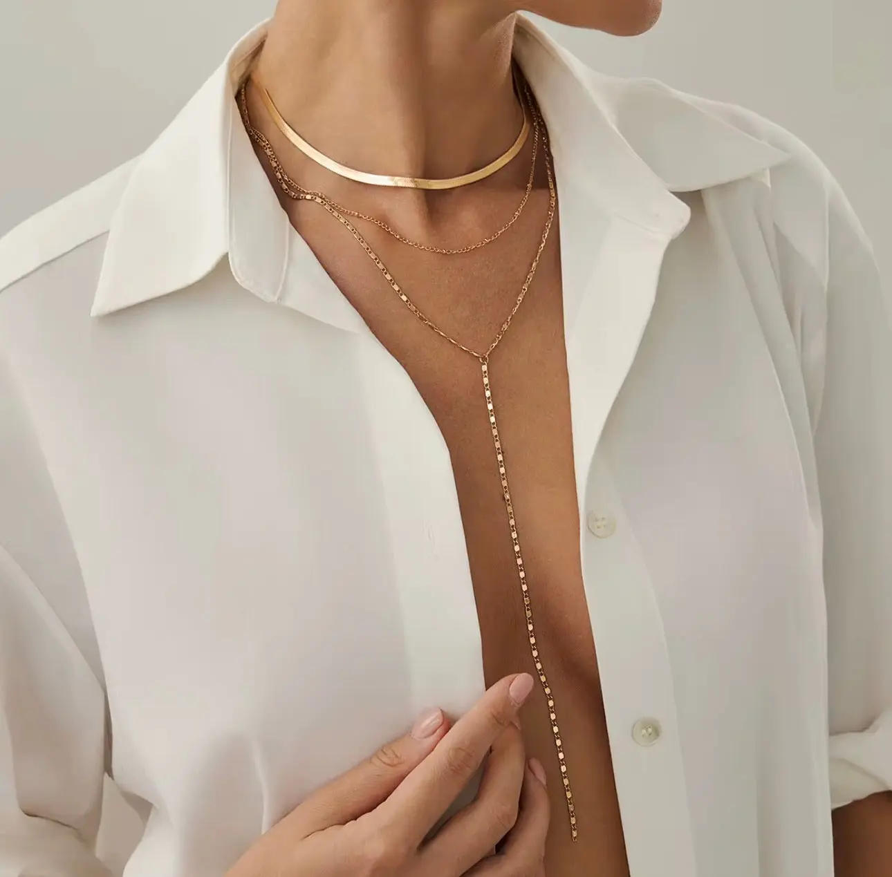 Each layer is thoughtfully arranged to create depth, balance, and movement, giving you a perfectly styled look without the need for stacking multiple pieces. The vertical drop chain adds a subtle statement, drawing the eye and adding a modern, sophisticated edge.