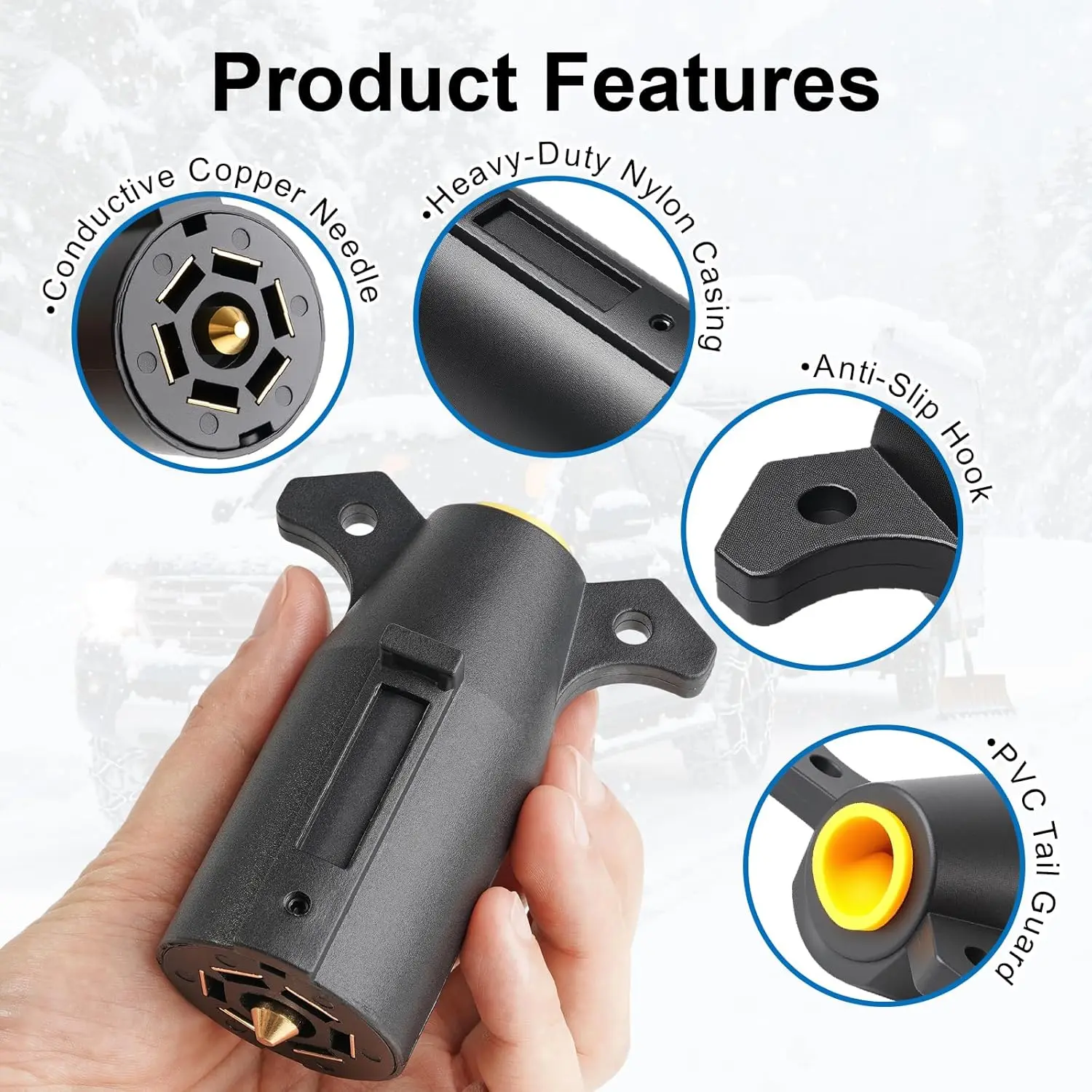Easy Grip: The 7 pin round trailer plug features an ergonomic design with two hooks on each side for comfortable handling, allowing for effortless insertion into the tow vehicle's socket