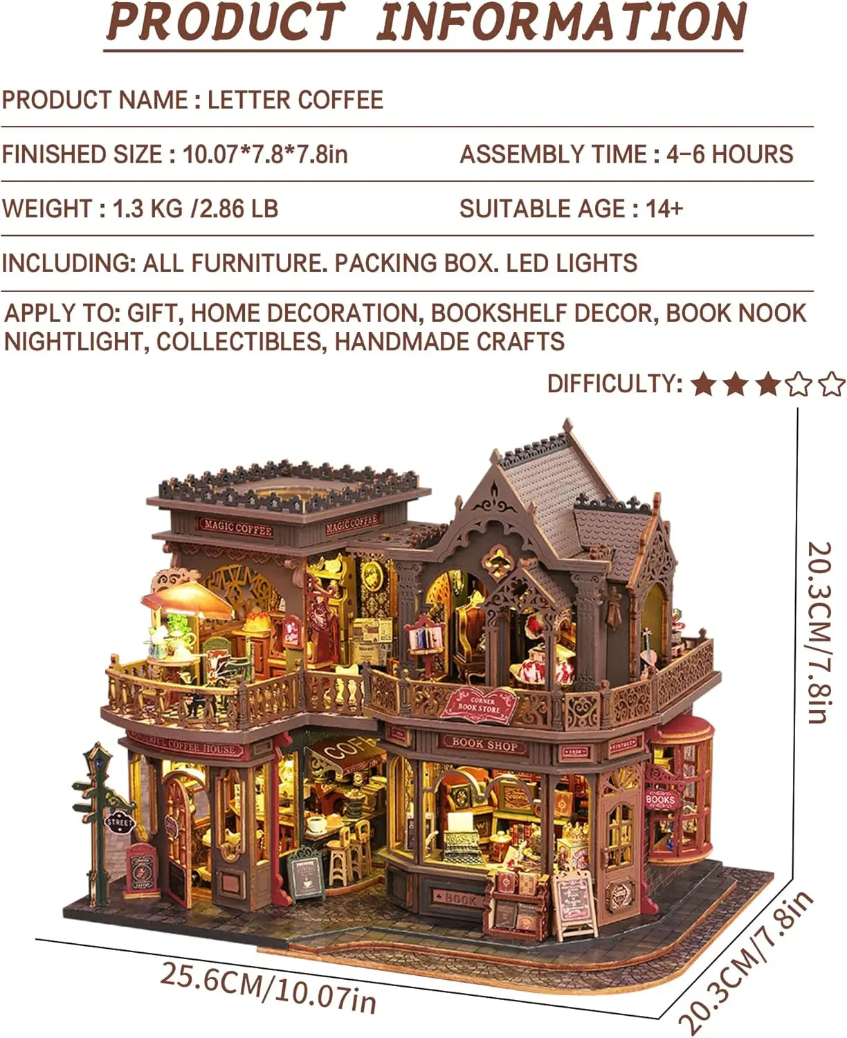 ·***Stunning Miniature Scene for Home Decor: The surprises don't stop with assembly! The DIY miniature kit has a built-in soft, touch-sensitive LED light. Gently open it, the warm light instantly penetrated the entire coffee house, creates a romantic and vintage atmosphere, perfectly matching the style of the coffee house. Place the completed tiny house on your desk, bedside table, or bookshelf to create an artistic miniature scene. It's the perfect home decoration for adding a touch of retro charm to your office, living room, or bedroom.