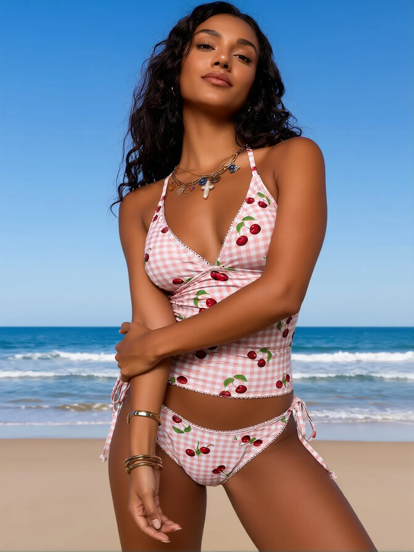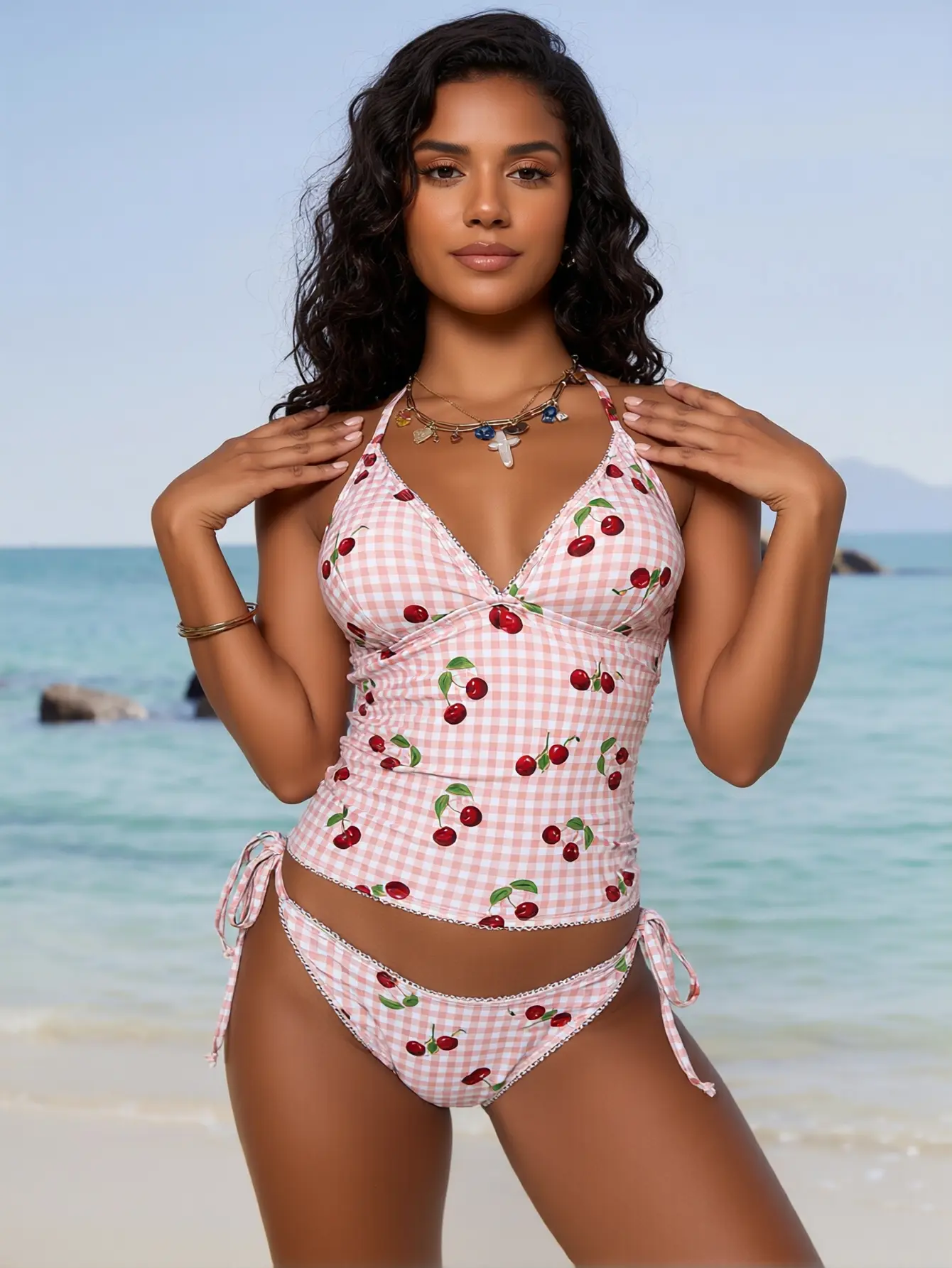 2026 summer cute pink plaid cherry print two-piece swimsuit set V-neck halter swimwear two-piece set perfect for beach vacation, pool party