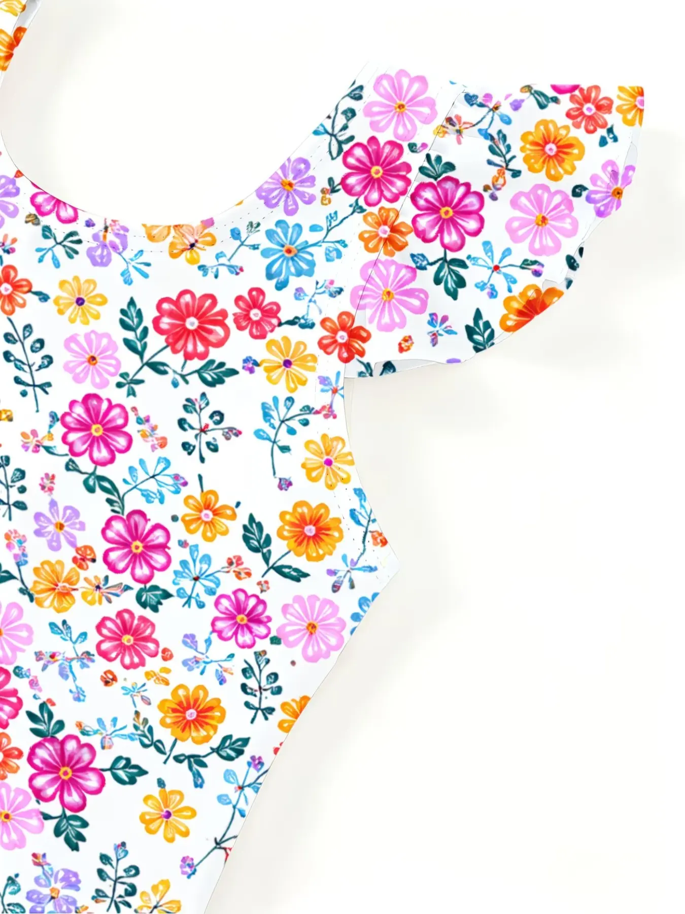 Colorful Floral Print Girls' Jumpsuit, Cute Cartoon Print, Ruffled Quick-Dry Kids Swimwear, Fashion Swimsuit, Beach Party