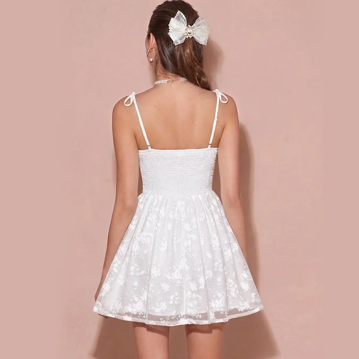 Woman's Jacquard Elastic Mesh Spaghetti Strap Backless Mini Dress, Breathable Skin-friendly For Spring Summer, Smocked Back Bow Tie Cinched Waist A-line Short Dress, Sweet Pure Style Photogenic Outfit For Dating Picnic Brunch Graduation Photos