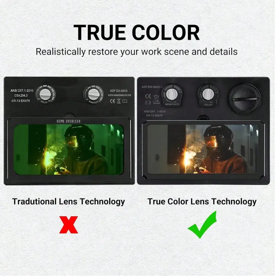 ✨ True Color Auto-Darkening Helmet for TIG, MIG, and ARC welding. This fixed shade welding hood ensures optimal visibility and protection. Perfect for professional and DIY welders, it adapts to the welding process automatically.