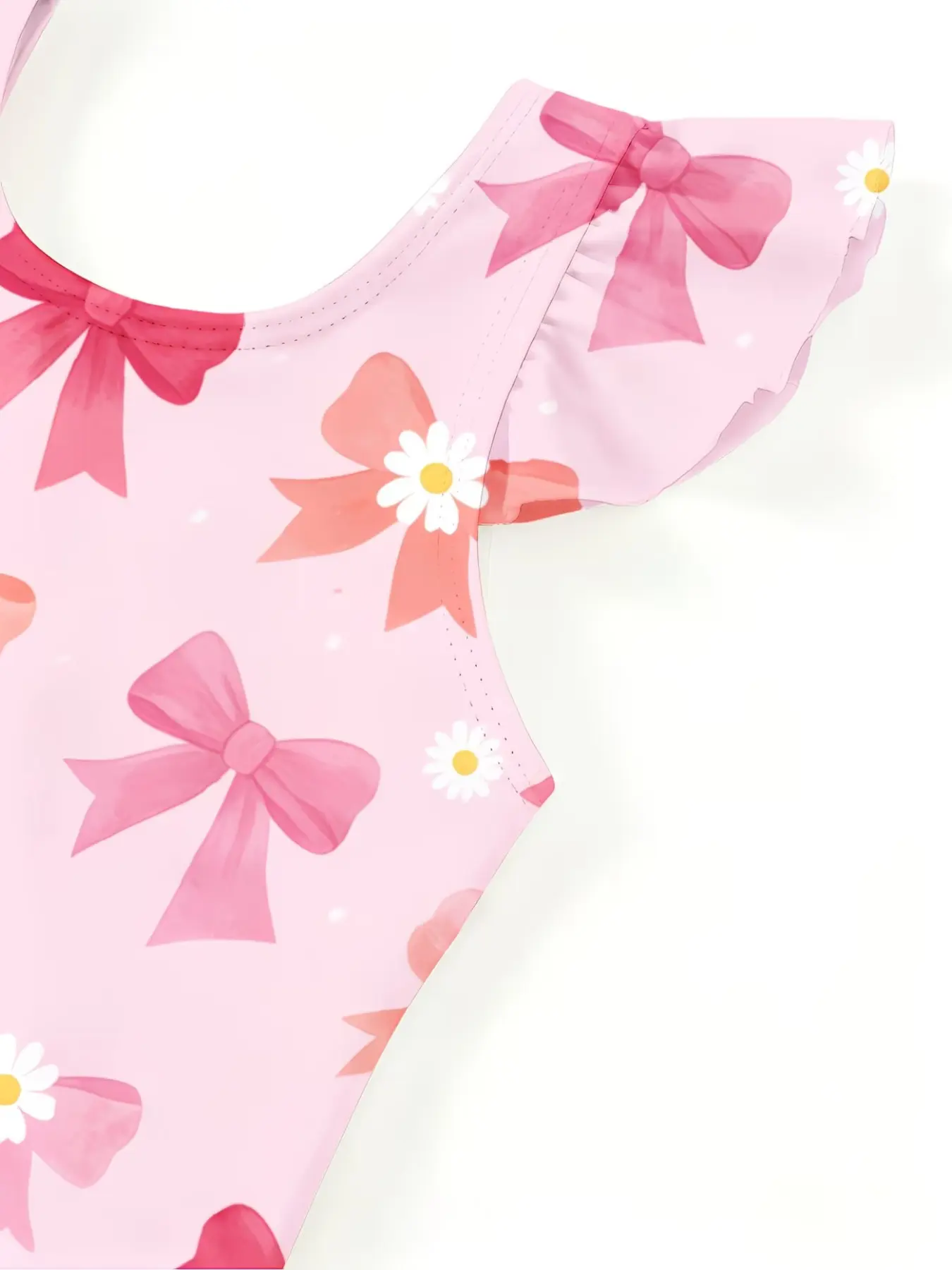 Bowknot Print Girls' Jumpsuit, Cute Cartoon Pattern, Ruffled Quick-Dry Kids Swimwear, Fashion Swimsuit for Beach Parties