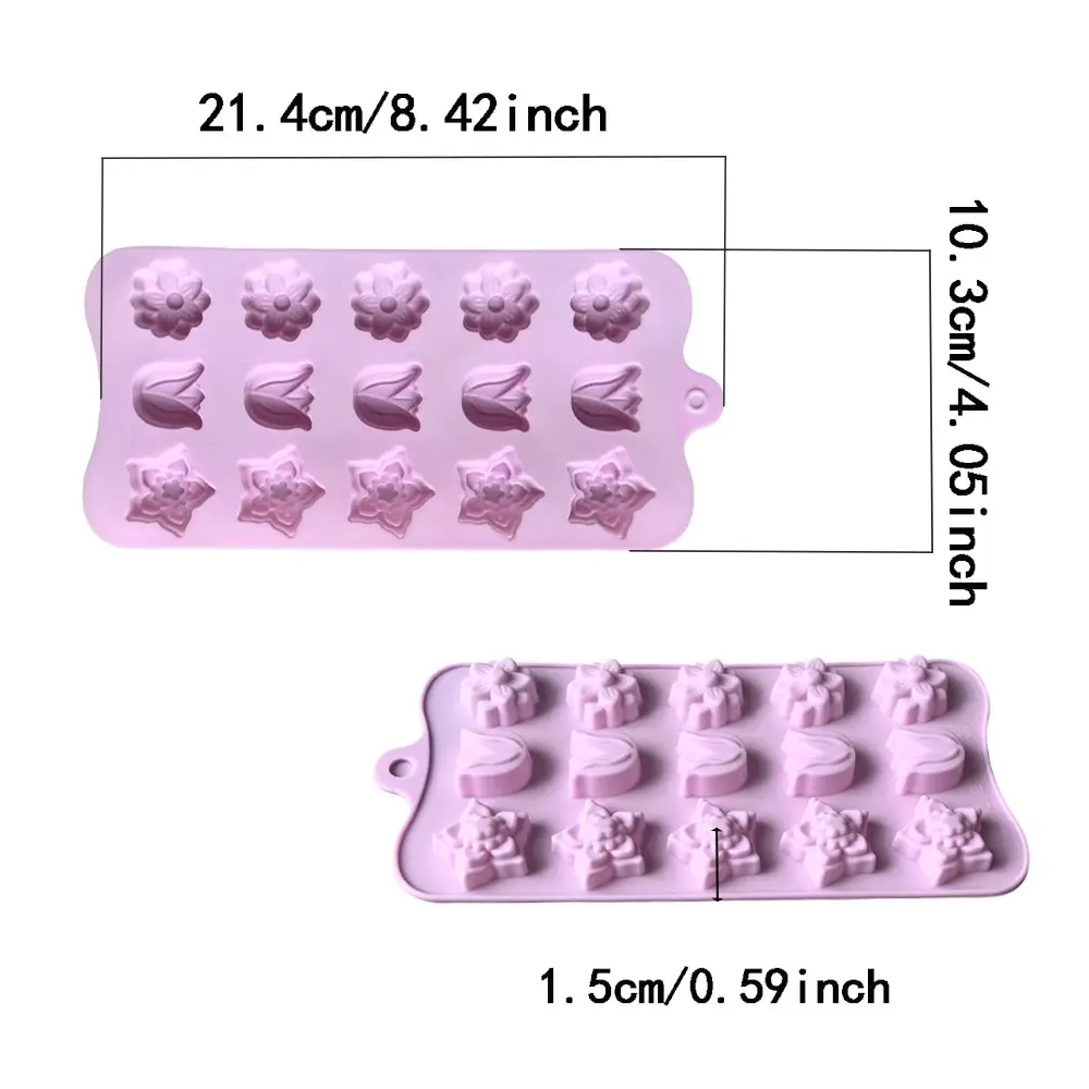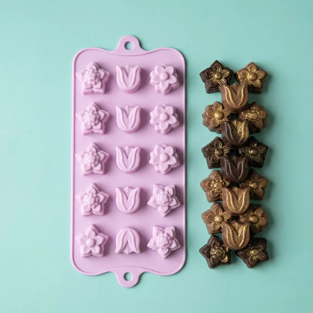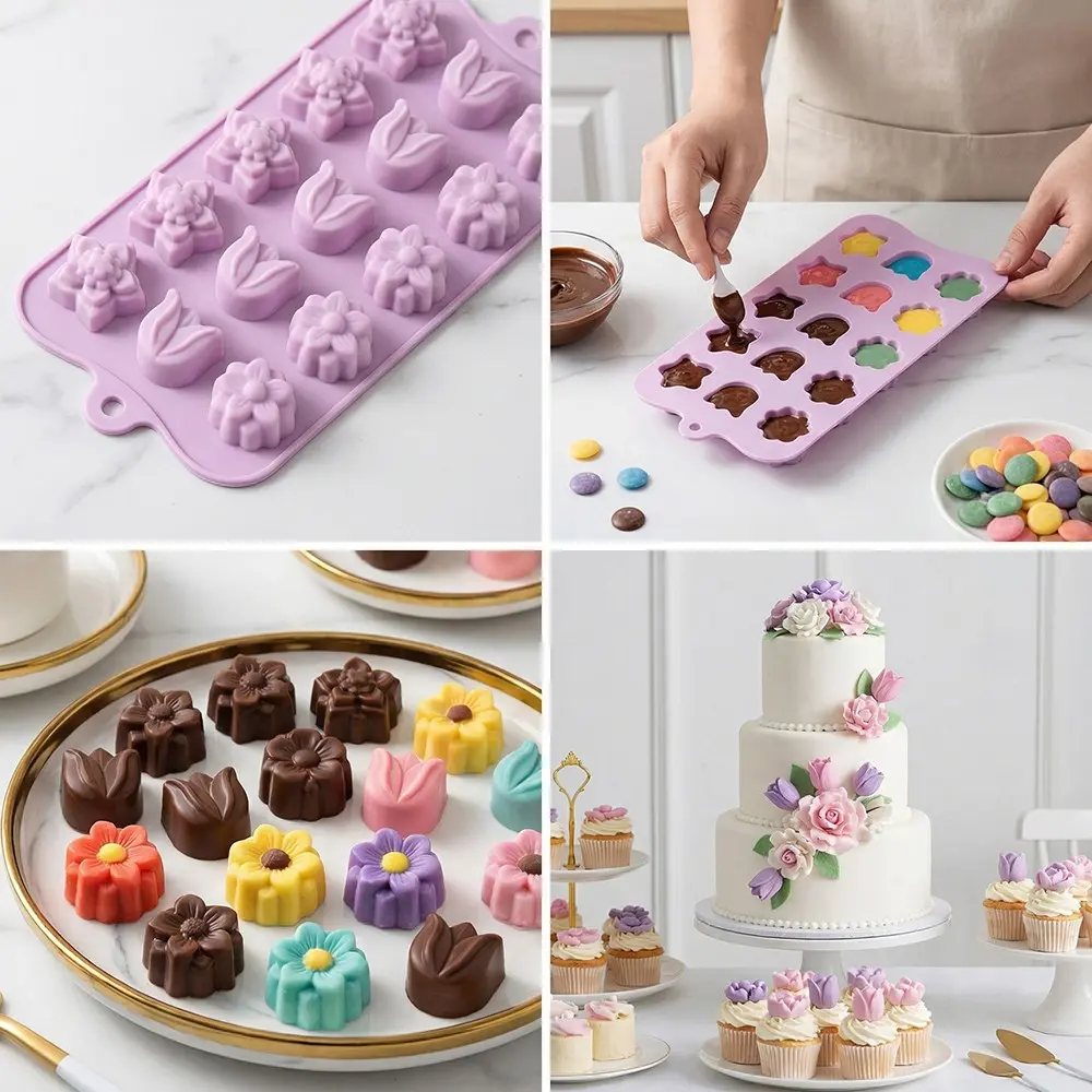 5. 3pcs Tulip Shape Chocolate Silicone Molds, DIY Candy Pudding Baking Cookie Birthday Cake Decoration, 15 Cavity Mold Set