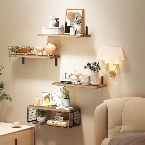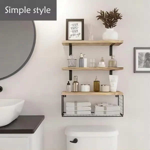 Maximize your wall space with this multi-tiered design, ideal for organizing small spaces. The three solid wooden shelves provide ample open storage for daily essentials, while the bottom wire basket adds a versatile, ventilated storage zone.