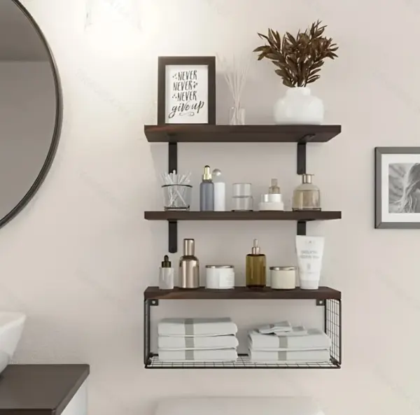 ·Material: Crafted with high-quality, thickened dark brown wood shelves (water-resistant and easy to clean, ideal for bathroom use) paired with sturdy black metal brackets and a wire basket, ensuring long-lasting durability and a sleek, industrial-rustic aesthetic.