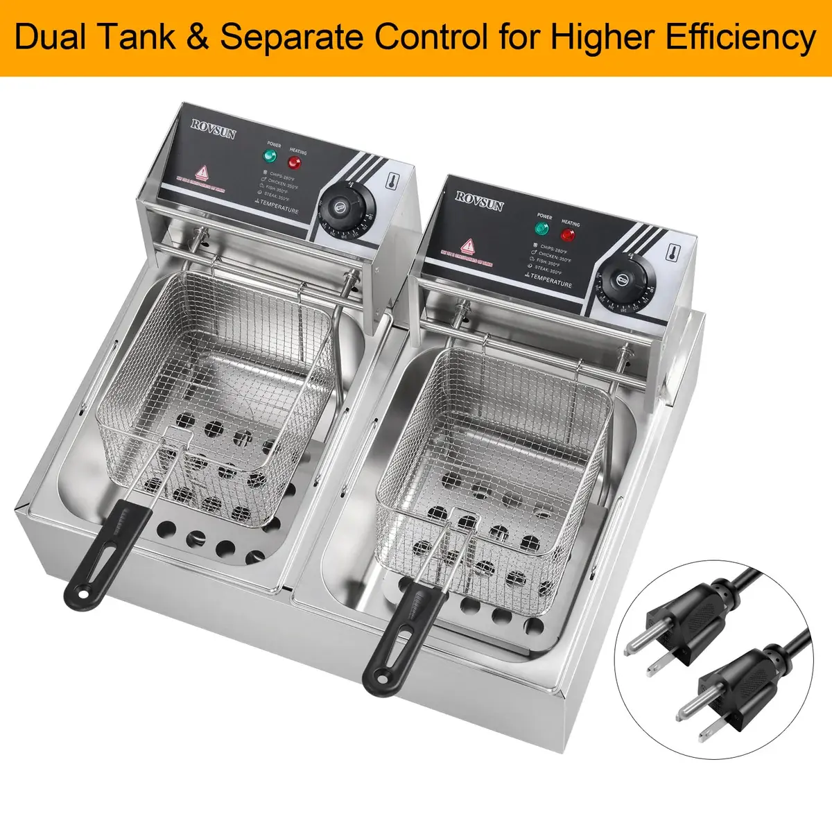 1. 22.8QT CAPACITY: Dual electrical heads and power plugs for single large capacity tank application. The dual deep fryer allows you to fry different food in each tank at different temperatures! It can save your time to make different food. Total max. Recommended Oil Capacity: up to 13.7QT/12.96L. Single Basket Capacity: 4.2QT/4L.