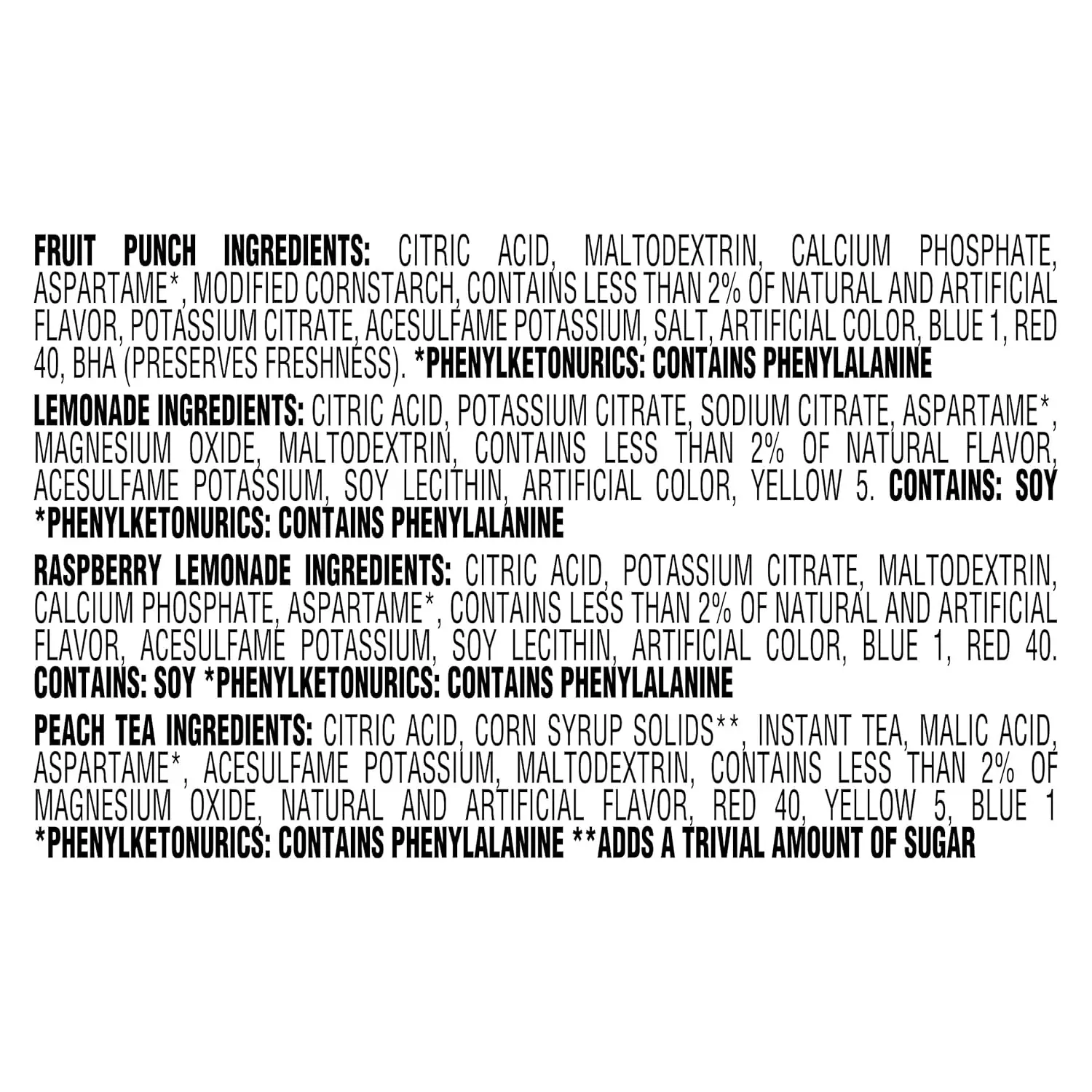 ·Raspberry Lemonade: Citric Acid, Potassium Citrate, Maltodextrin, Calcium Phosphate, Aspartame, Natural & Artificial Flavor, Acesulfame Potassium, Soy Lecithin, Artificial Color, Red 40, Blue 1, Tocopherol