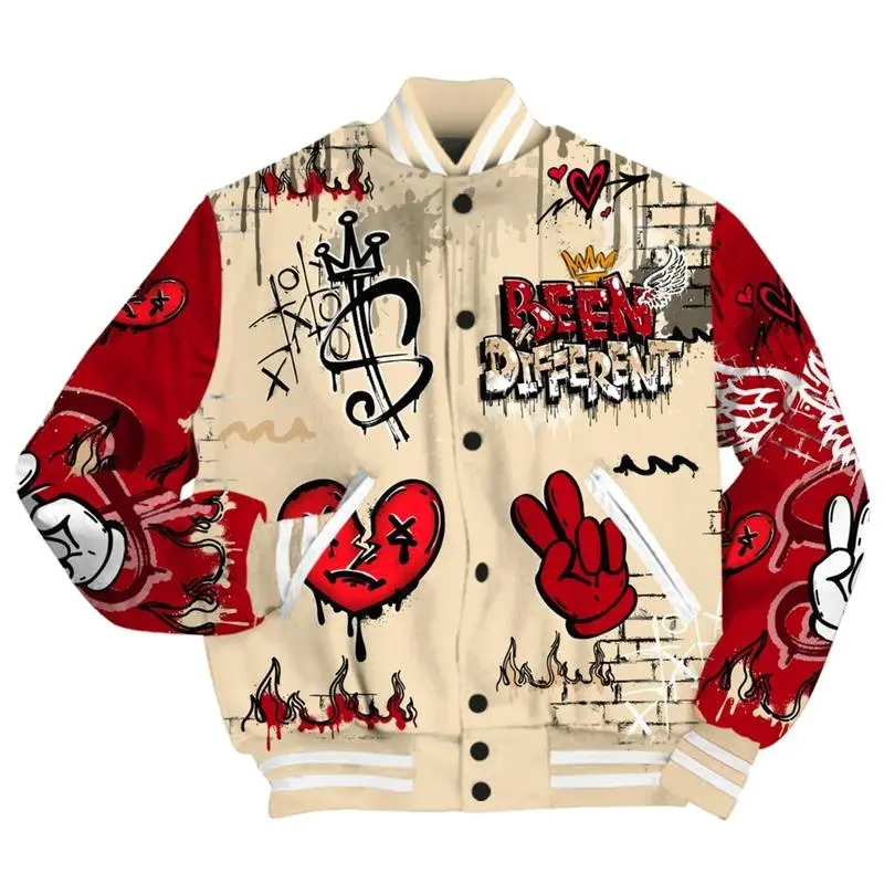 Varsity Jacket: Dunk Low Strawberry Waffle, Been Dif2erent Print Stylish Outfit Jacket Oversized Fit Streetwear Fall Winter Spring Bomber Coat For Men Women Casual Style Gen Z Hip Hop Sports Baseball Outerwear