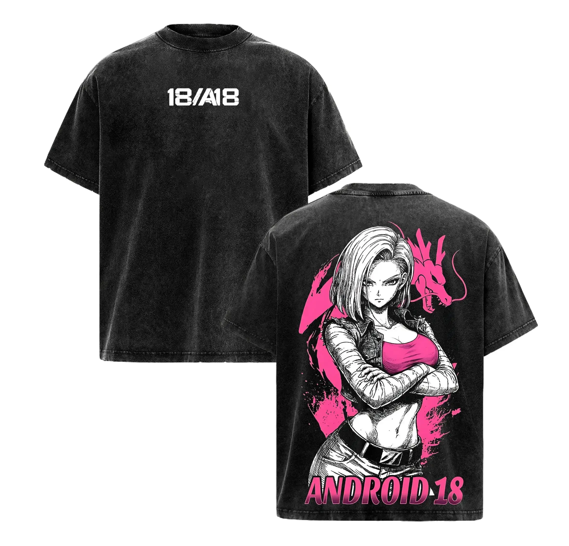 Android 18 DBZ Vintage Washed Oversized Anime Shirt, Strong Waifu Pink Aesthetic Graphic Tee, Heavyweight Cotton Streetwear, Unisex Gift