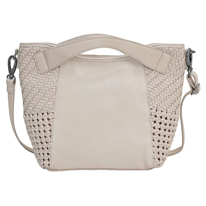 Features a woven leather side panels. Inside, it features 2 open pockets, a zip pocket, a cell phone pocket, and a full organizer to keep your essentials in order.