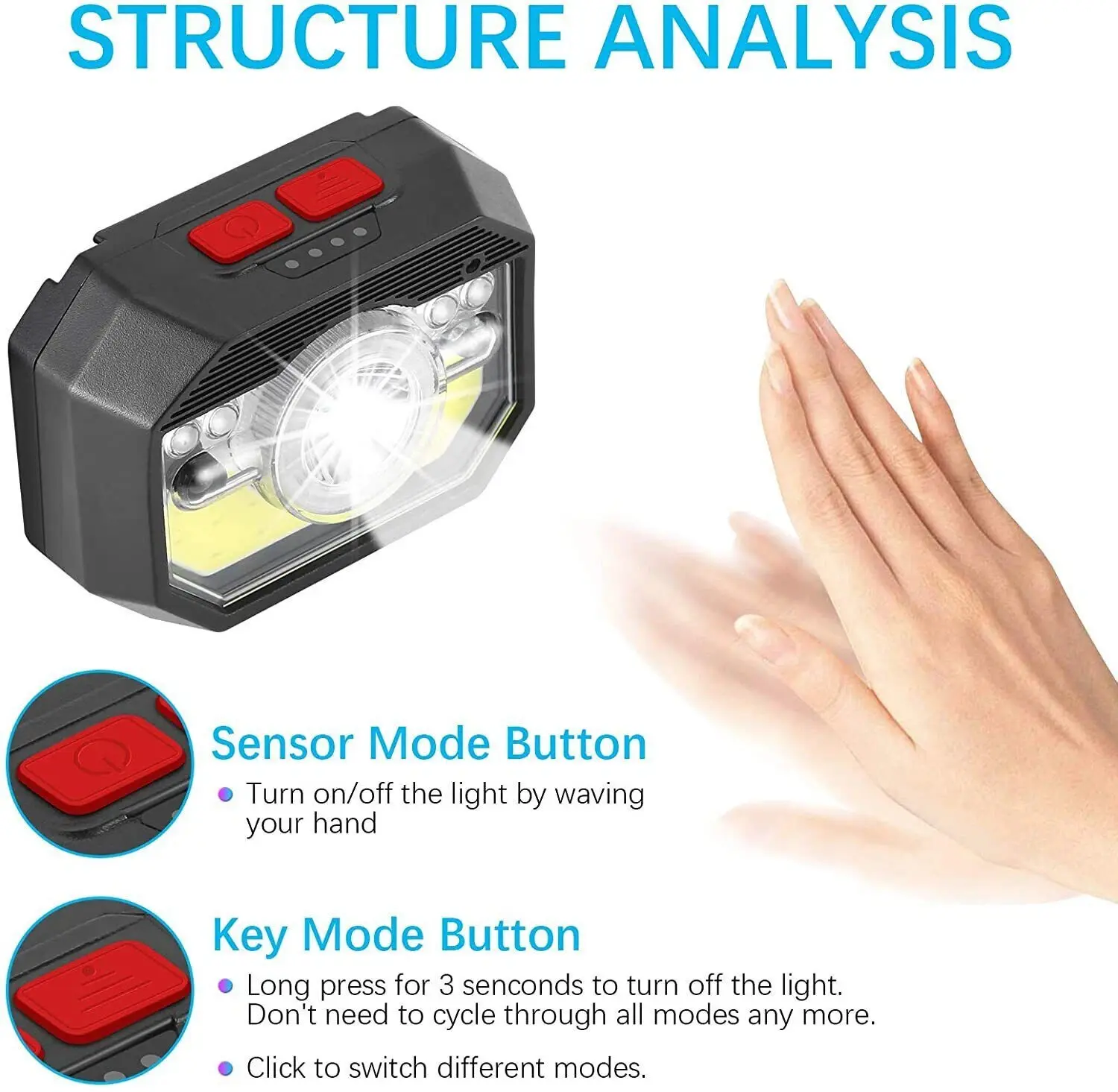 You can easily control the light on and off by waving your hand as it is equipped with the latest smart sensors. Please turn on the head lamp and the induction switch at the same time.