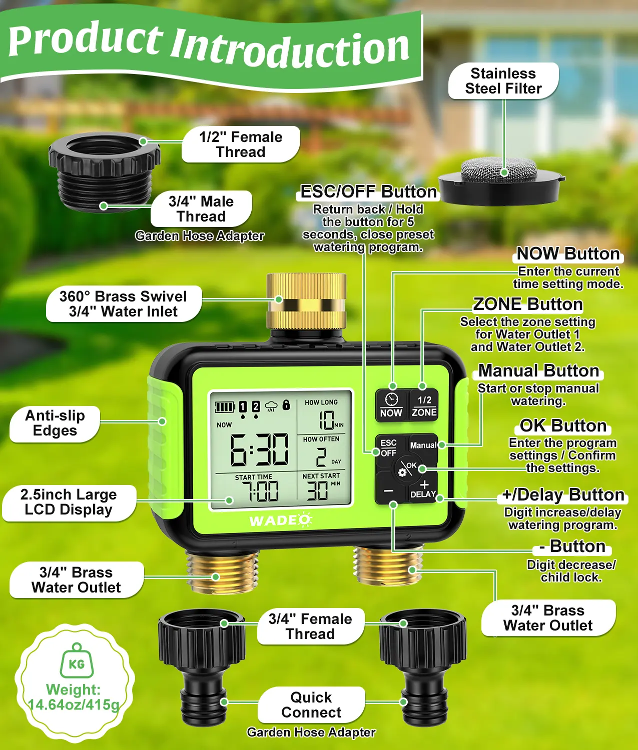 ✨ Durable Brass Fittings: This timer boasts solid brass inlet and outlet fittings, surpassing ordinary ABS plastic. It withstands up to 116 PSI, ensuring a leak-proof, safe connection. The built-in metal filter washer removes impurities like sand and gravel, preventing clogging and extending the device's lifespan. Ideal for outdoor garden watering.