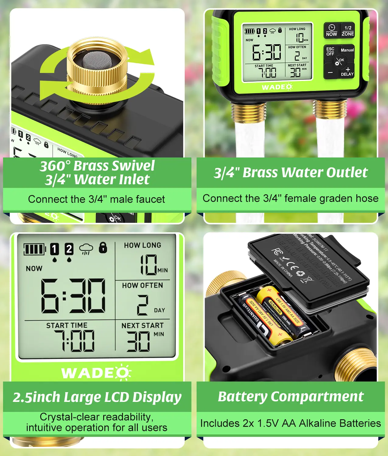 🔋 Clear Display & Convenience: The large LCD screen displays battery level, time, schedule, and next watering countdown. A low battery indicator alerts you, and the valve closes to prevent water waste. The package includes 2 AA alkaline batteries. Just install and go!