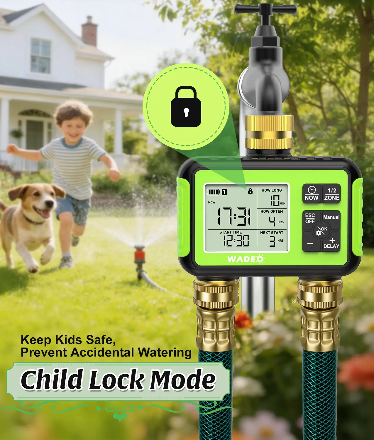 🔒 Flexible & Safe: Manual mode allows instant watering without altering schedules. Rain delay mode pauses watering for 1–15 days, preventing overwatering. Child lock mode avoids accidental changes, keeping settings safe. Adjust run times from 1–360 minutes for maximum flexibility.