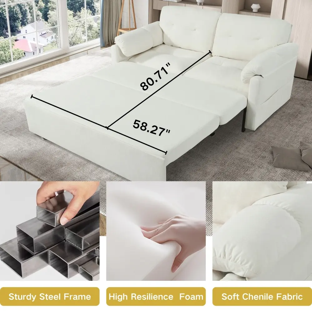 Sturdy & Durable Constructio.Built with a robust premium steel frame and reinforced stabilizing legs, this sleeper sofa is engineered for long-lasting durability and can confidently support daily use.