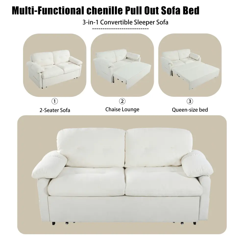 3-in-1 Convertible Design.Easily transforms to fit your needs: use it as a compact loveseat, pull it out into a relaxing chaise lounge, or fully extend it into a generous queen-size bed for overnight guests.