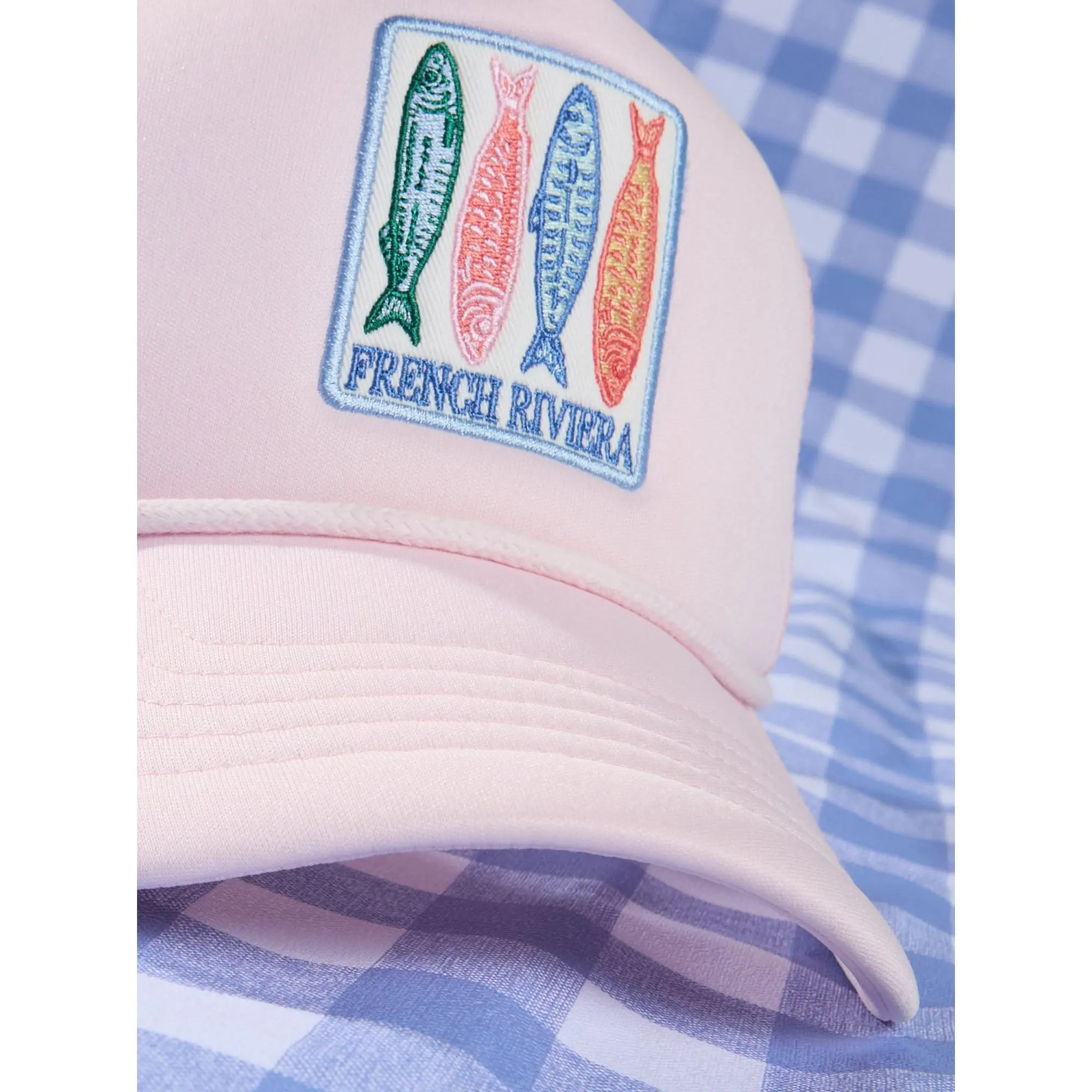 Capture the essence of a seaside getaway with this mesh-back trucker hat, featuring a rectangular embroidery of colorful sardines and the words "French Riviera." It is a breezy, effortless accessory perfect for adding a touch of coastal charm to your favorite casual looks.