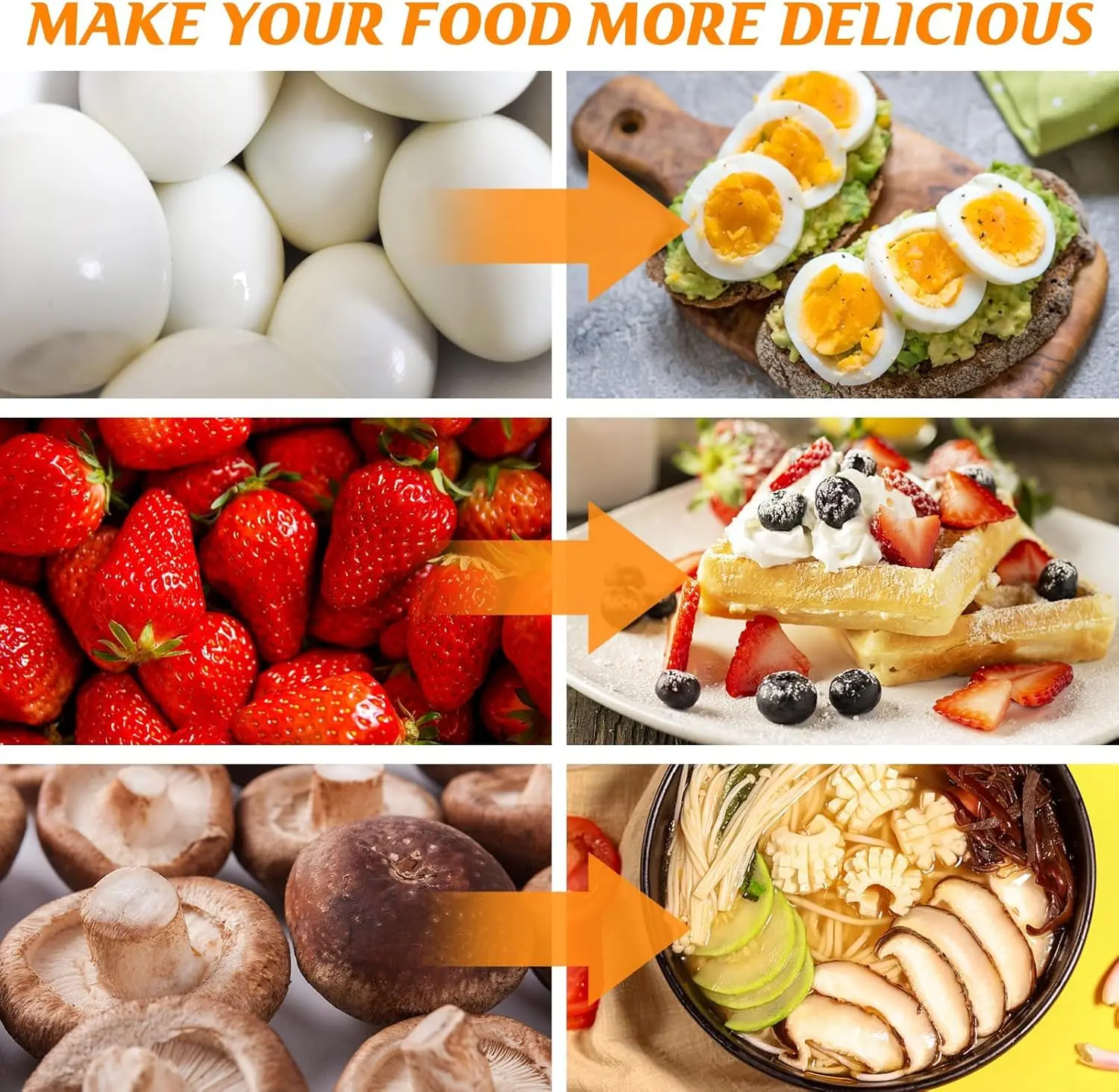 ·【WIDE APPLICATION】From bananas to strawberries, kiwis, even boiled eggs or mushrooms, this fruit slicer handles various produce effortlessly. Perfect for crafting fruit salads and an exceptional gift choice for your loved ones' culinary adventures. Experience a new level of culinary convenience!