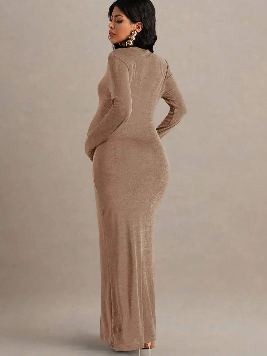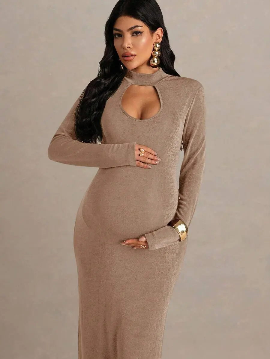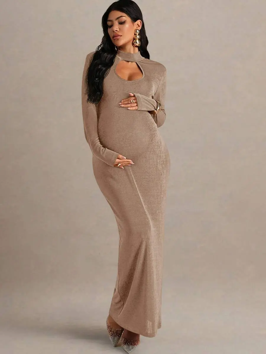 MISHELLA Maternity Solid Color Hollow Out Design Long Sleeve Fitted Elegant Dress Beige Dress Pregnant For Photoshoot