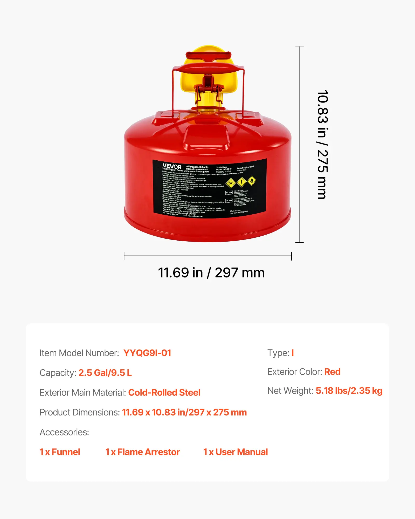 Compact Tank Can: This 2.5 gal compact metal fuel can measures only 11.69 x 10.83 in/297 x 275 mm, with a small size that takes up little space. It is easy to take out and use in garage corners, shelves, or vehicle trunks, meeting diverse needs