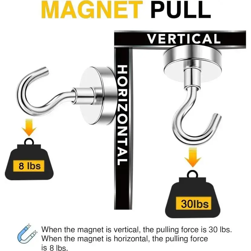 Note: Ensure the surface is iron-based and smooth for best magnetic strength. The 30 lbs pull strength applies to vertical use; if used horizontally, reduce the weight by 2/3. For heavier items, consider using multiple hooks or hanging vertically.