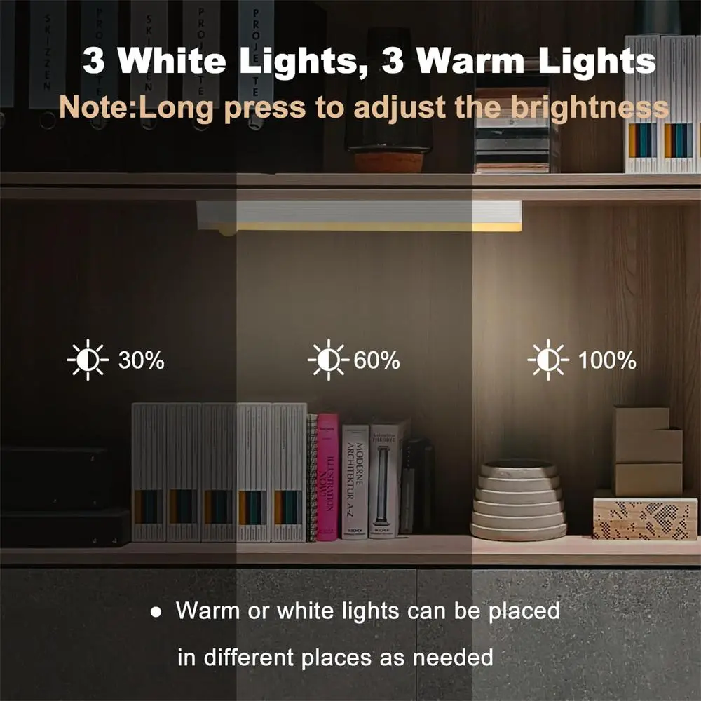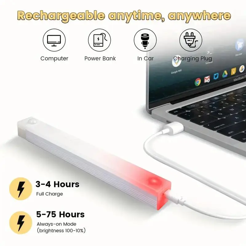 USB Rechargeable & Energy-Saving: Equipped with a rechargeable battery, this indoor motion-sensing light enhances versatility.Auto-turns on and shuts off after 20 seconds of inactivity.The motion sensor light uses an A+ grade lithium polymer battery featuring high energy density and extended cycle life.(Charging: Red light, Charged: Green light) (Charge before first use) Wireless Installation: Closet lights feature magnets and a 9mm-thick body, allowing direct attachment to magnetic metal surfaces or mounting on installation strips for non-magnetic surfaces.These under-cabinet lights can be easily removed for temporary lighting, charging, or repositioning.Versatile Applications: Ideal for kitchens, bedrooms, closets, cabinets, workshops, garages, stairwells, hallways, storage rooms, and more.