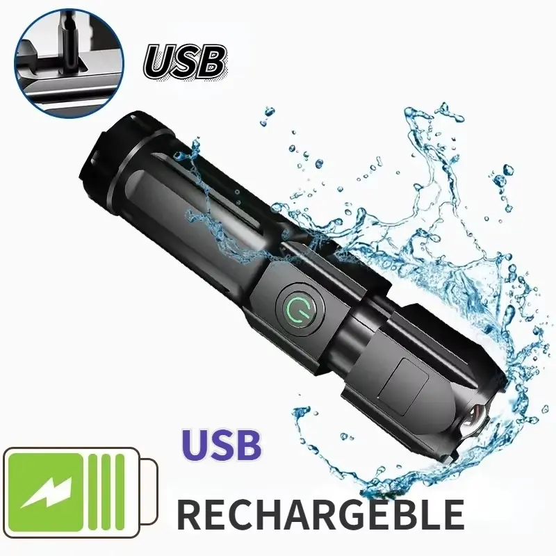 This flashlight features a rechargeable battery that can be easily charged using a USB cable.