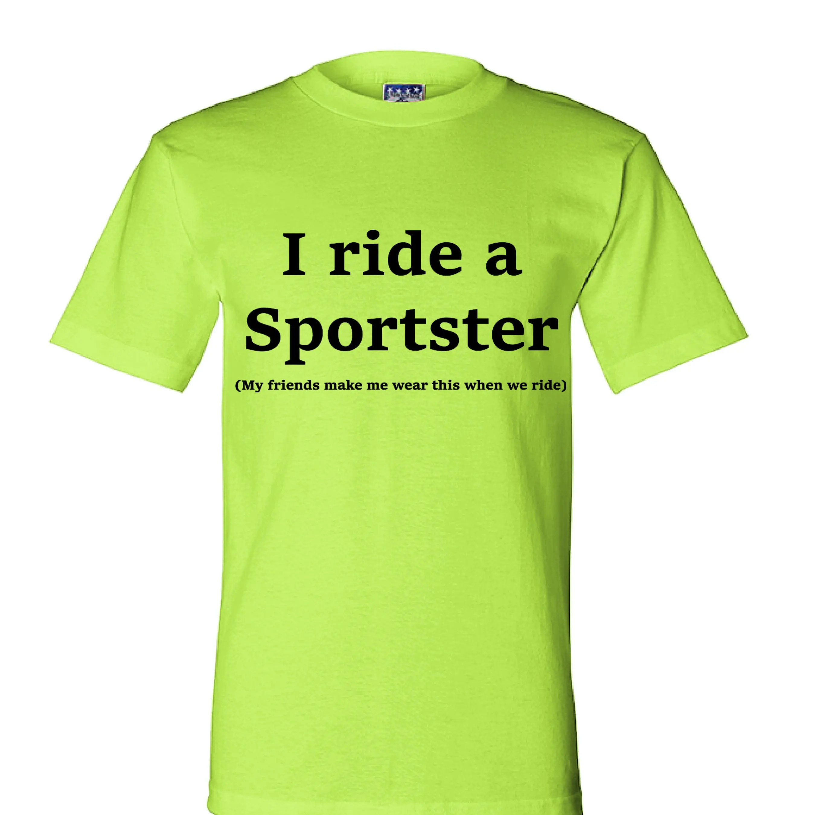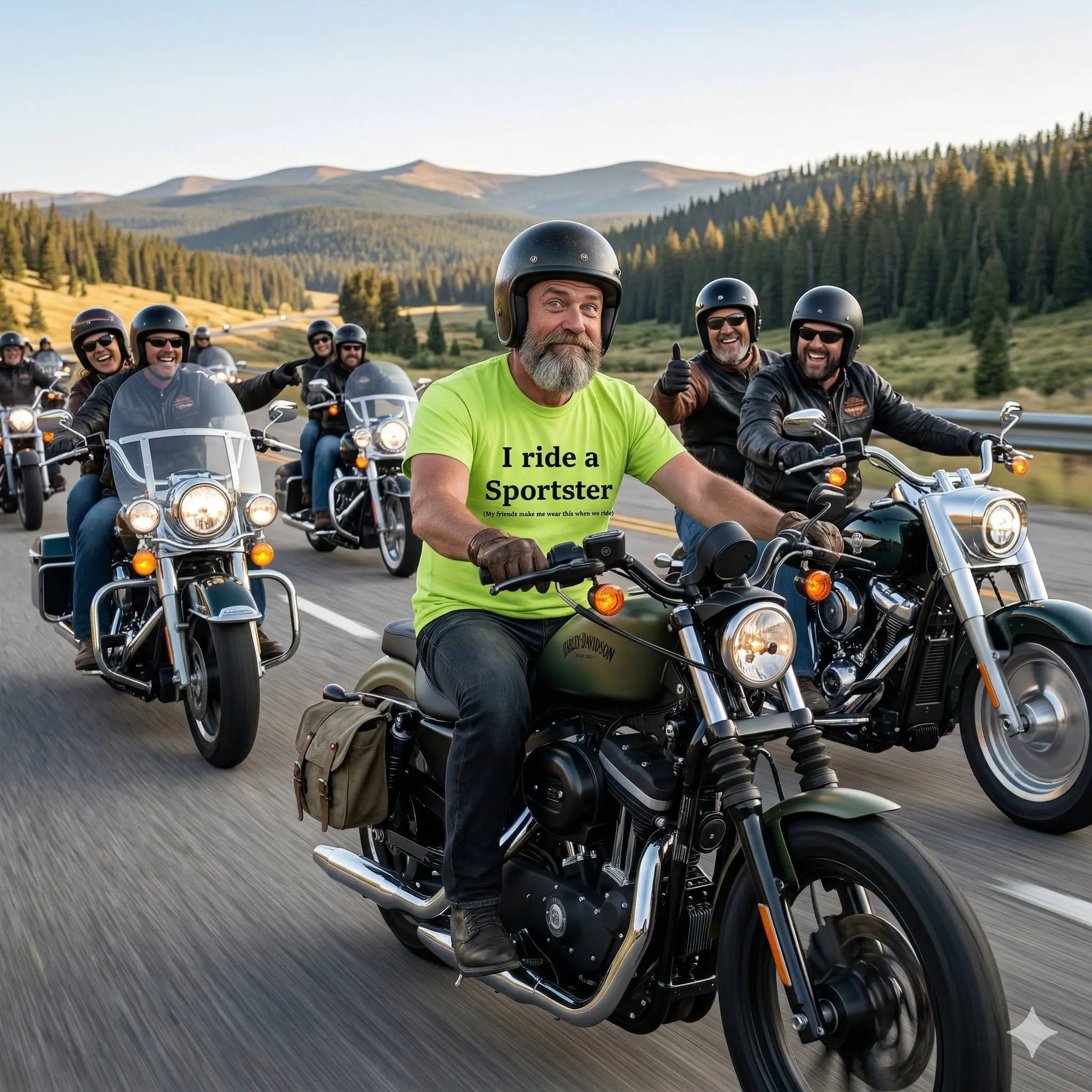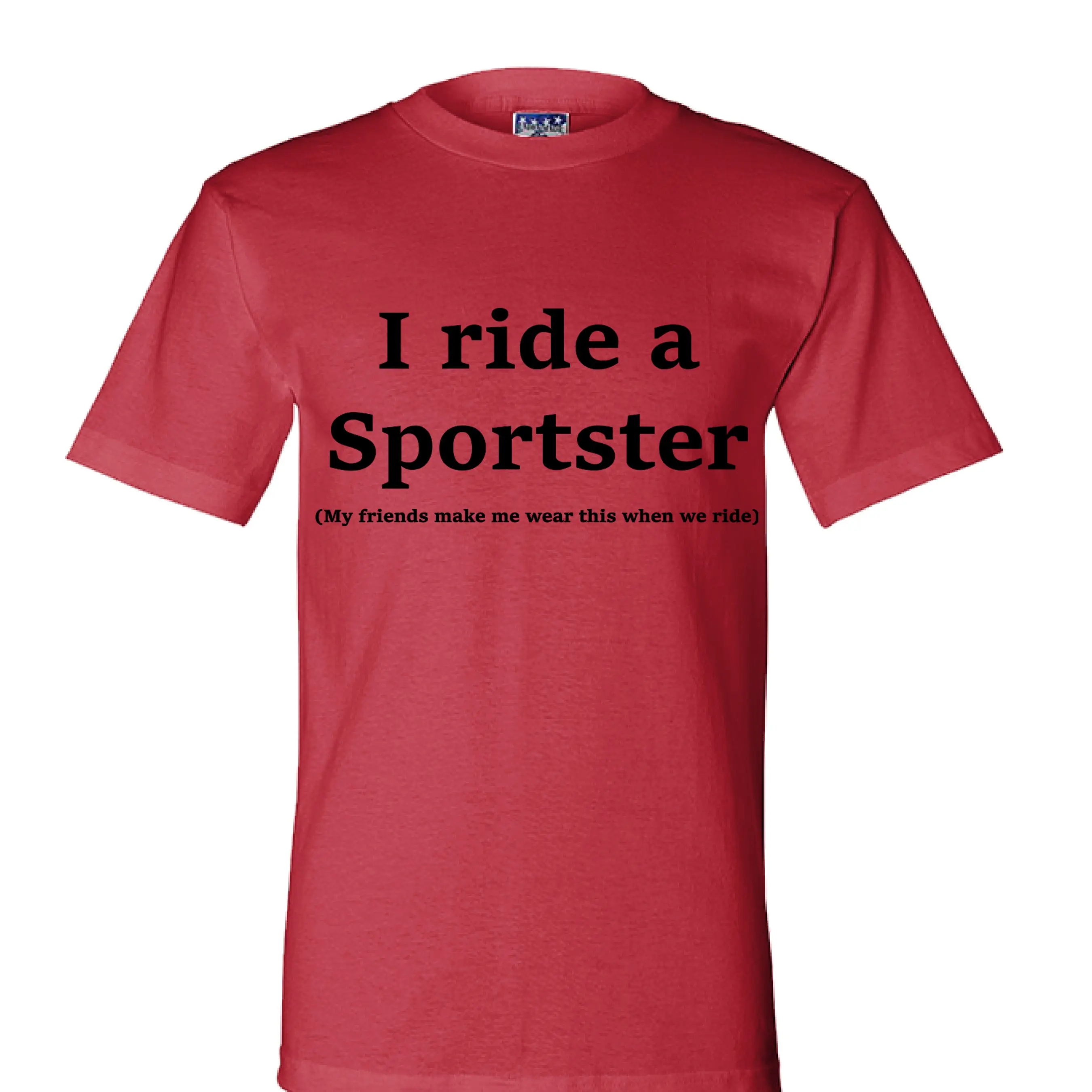 Tired of catching grief from your buddies on the big baggers? Lean into the punchline with the ultimate self-deprecating biker tee. This shirt features "I RIDE A SPORTSTER" in massive, unmistakable letters, followed by the hilarious disclaimer: "my friends make me wear this when we ride." Whether you're hitting bike night, pulling up to the local watering hole, or looking for the perfect gag gift for the Sportster rider in your life, this shirt guarantees laughs. Printed on our premium, ultra-soft blank, it’s comfortable enough for long rides and durable enough to withstand the garage. Wear it with pride (or at least, because your friends made you).
