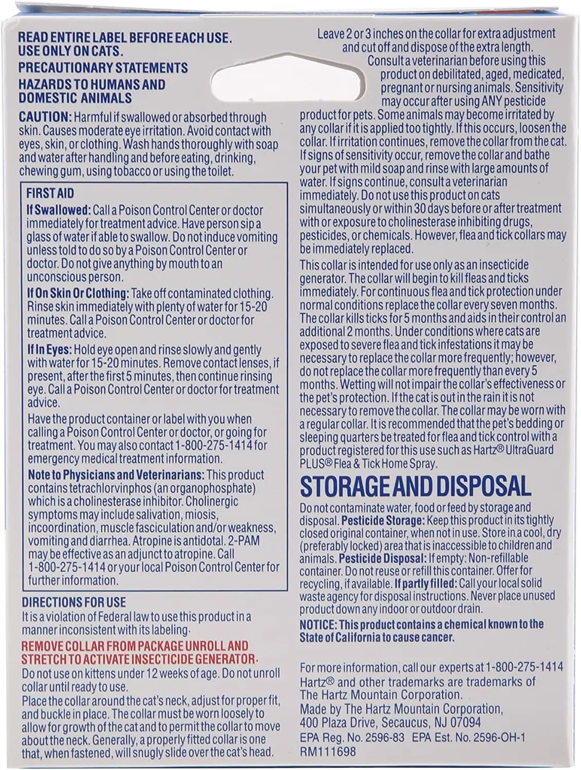 Tell pesky parasites to ‘bug off’ with the Hartz UltraGuard Flea & Tick Collar for Cats and Kittens. This fresh scented, white collar kills and repels fleas and ticks for 7 months. The water resistant design remains effective even after getting caught in the rain. Also features a breakaway safety release. For continuous flea and tick protection from head to tail, replace the collar every 7 months. Directions: Remove collar from package, unroll and stretch to activate insecticide generator. Do not use on kittens under 12 weeks of age. Do not unroll collar until ready to use. Place the collar around the cat’s neck, adjust for proper fit and buckle in place. The collar must be worn loosely to allow for growth of the cat and to permit the collar to move about the neck. Generally, a properly fitted collar is one that, when fastened, will snugly slide over the cat’s head. Leave 2 or 3 inches on the collar for extra adjustment and cut off and dispose of the extra length. Consult a veterinarian before using this product on debilitated, aged or medicated pets. Sensitivity may occur after using any pesticide product for pets. Some animals may become irritated by the collar if it is applied too tightly. If this occurs, loosen the collar. If irritation continues, remove the collar and bathe your cat with mild soap and rinse with large amount of water. If signs continue, consult a veterinarian immediately. Do not use this product on cats simultaneously or within 30 days before or after treatment of other flea and tick products. However, flea and tick collars may be replaced immediately.