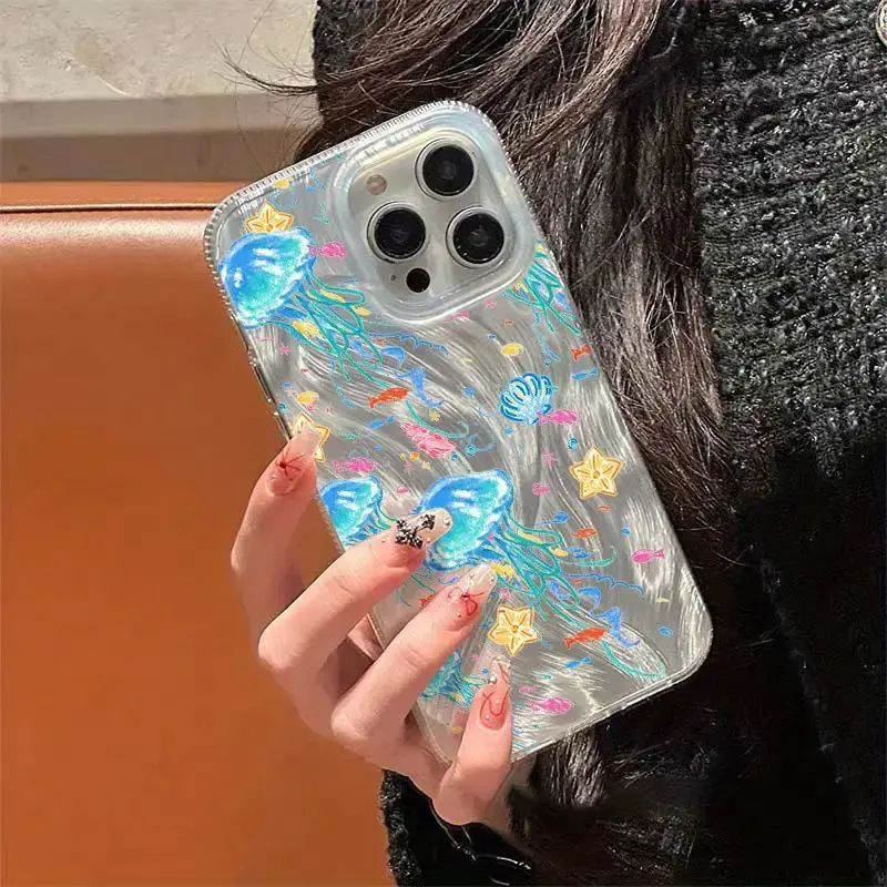 Vibrant Jellyfish Feather Cloth Phone Case for iPhone 17 16 15 14 13 12 11 Pro Max Plus & Samsung Galaxy S26 S25 S24 S23 S22 Ultra TPU PET Scratch-Resistant Shockproof Slim Fit Colorful Protection Cellphone Casing