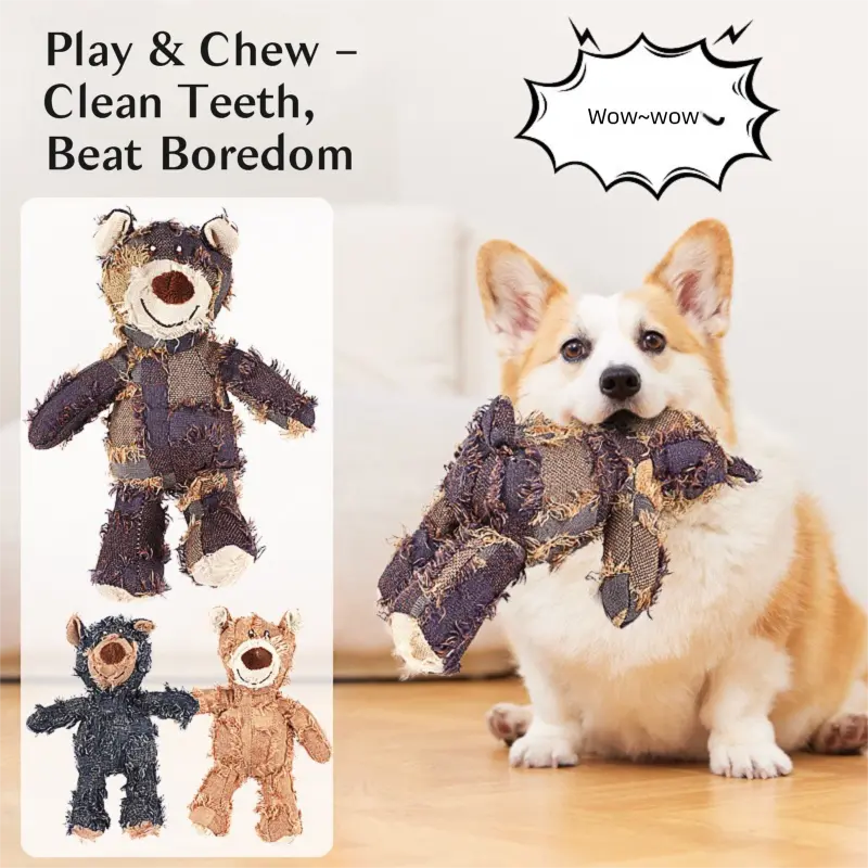 This bear-shaped dog toy is built for dogs who destroy regular stuffed toys in minutes.Made from industrial-strength, double-stitched plush fabric with reinforced seams, it resists tearing, ripping, and puncturing.The embedded dental ridges gently scrape away plaque and massage gums as your dog chews, promoting oral health.A hidden squeaker keeps your pup engaged without being annoyingly loud.Perfect for large breeds, heavy chewers, and dogs who need both mental stimulation and dental care.Say goodbye to shredded stuffing and hello to a toy that lasts.