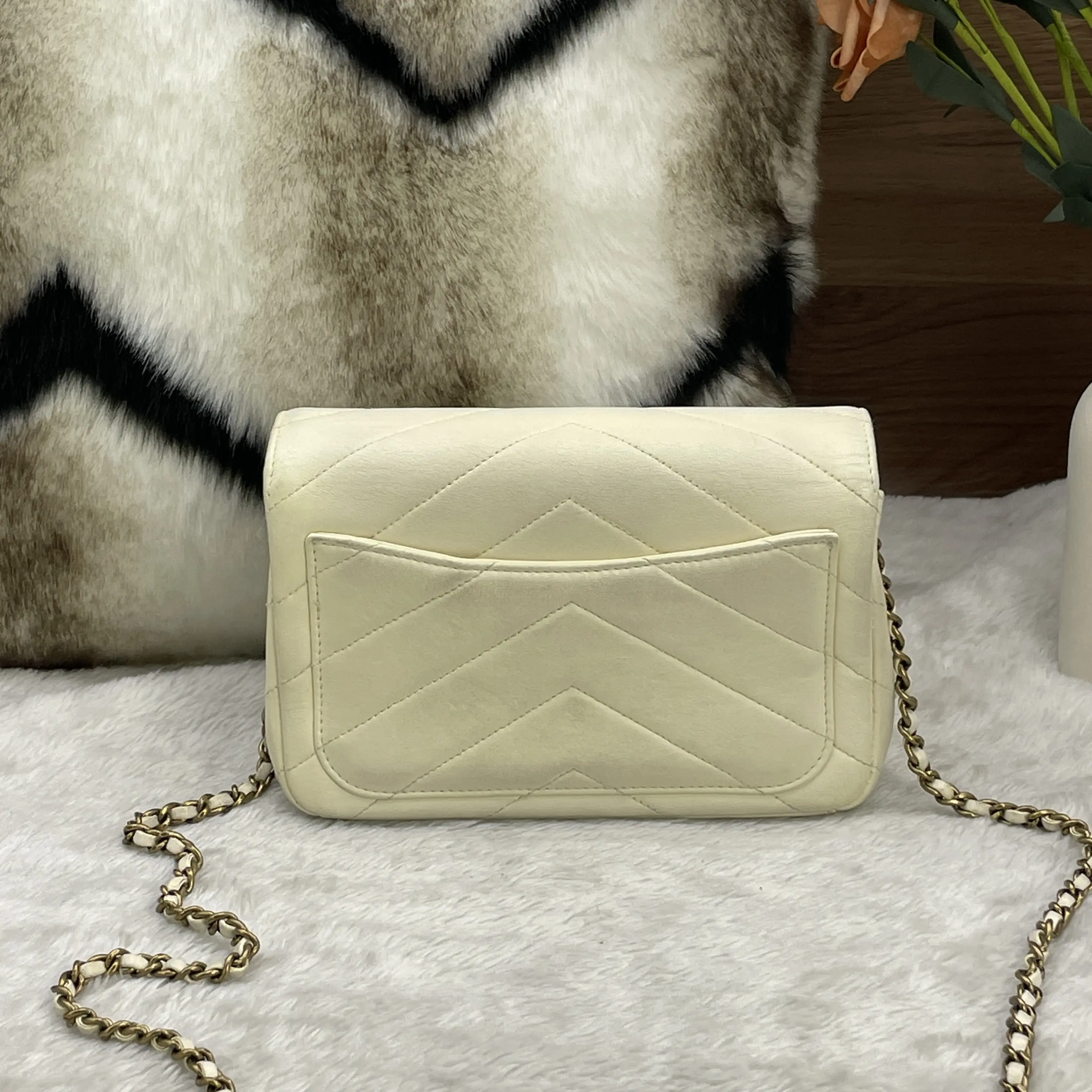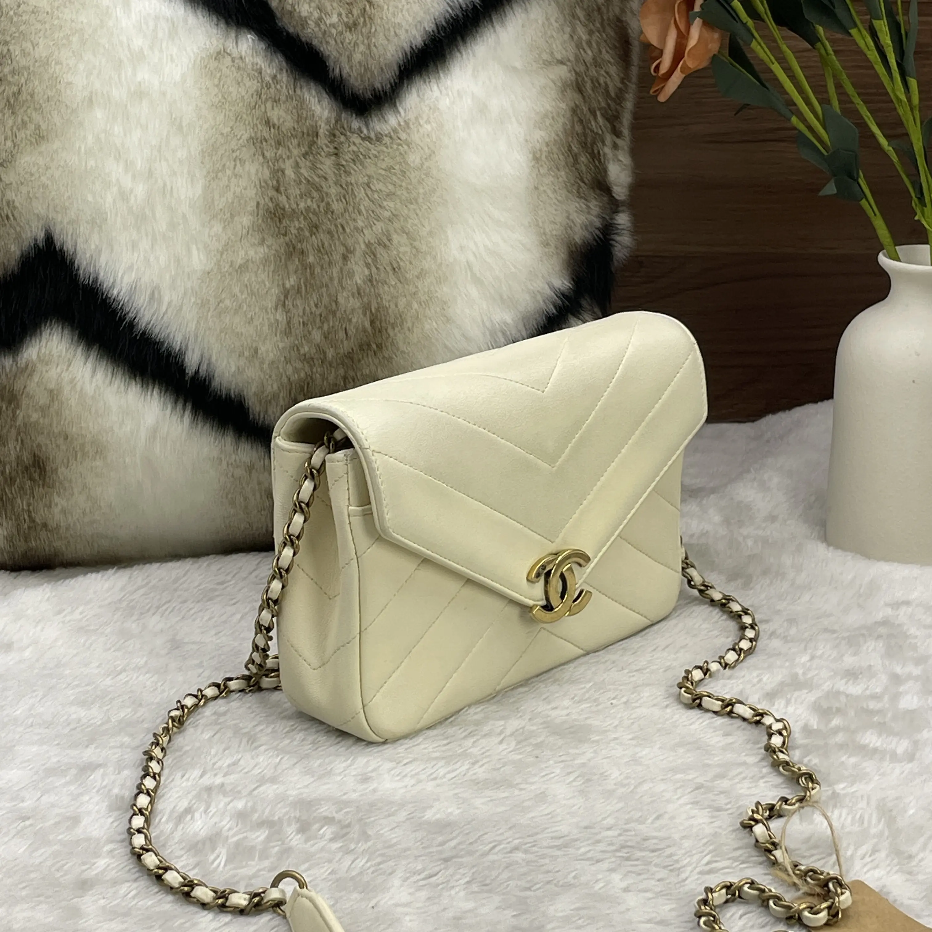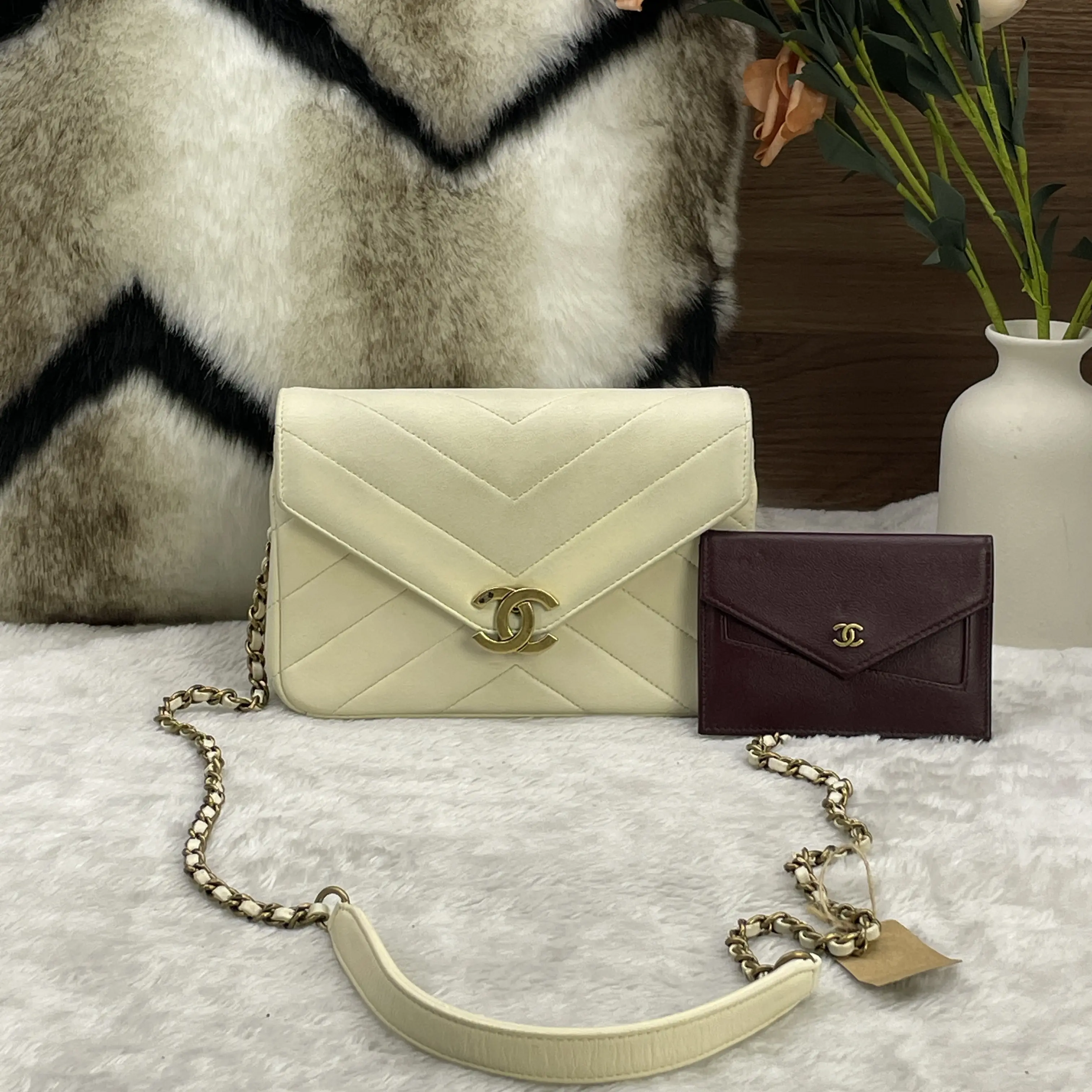 Chanel White V-Stitch Envelope Flap Bag with Gold Hardware (2-in-1 Set) + Small Card Holder